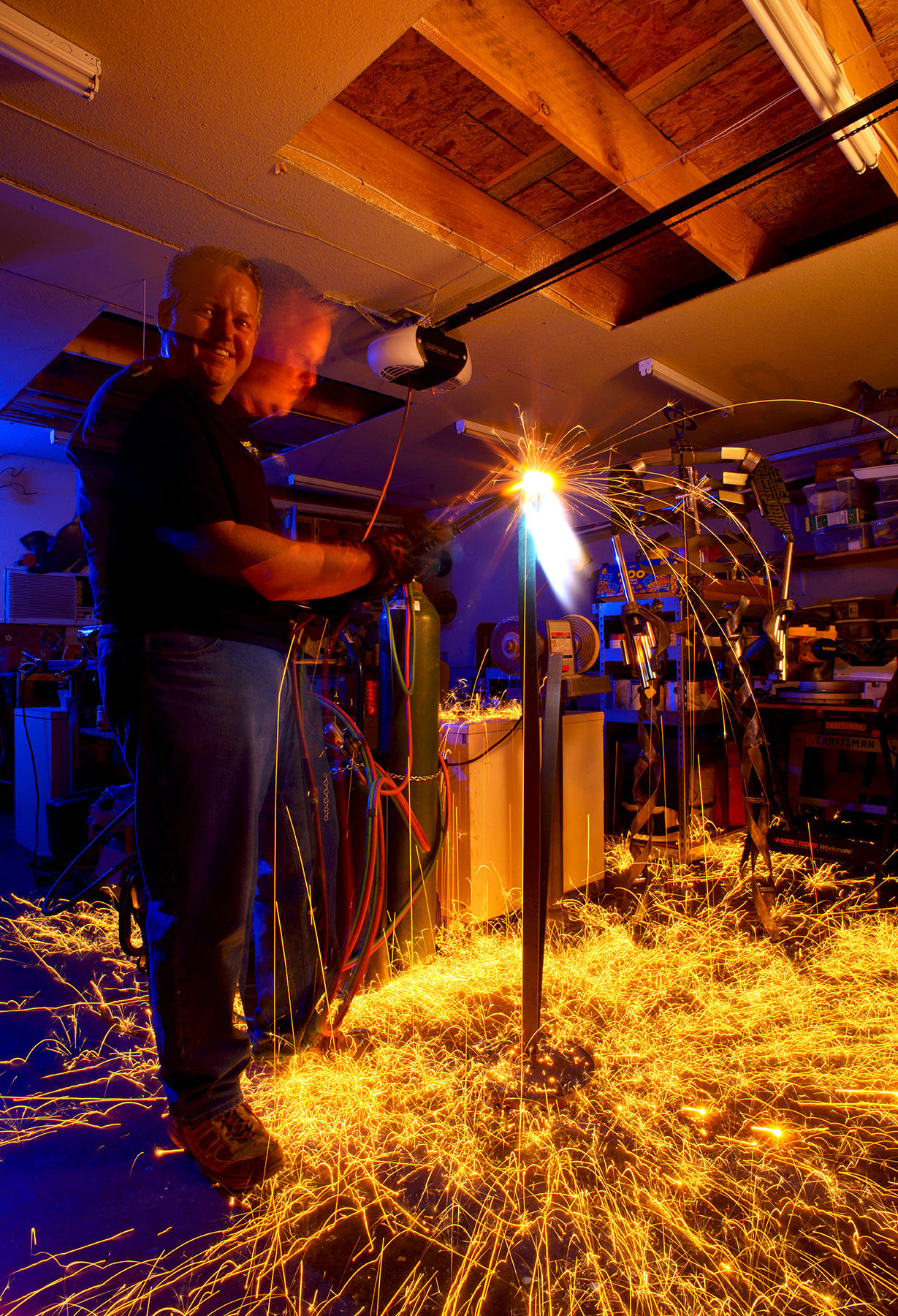 “Jargon aside, here’s the fun stuff: This shot, the one published in our print issue, was actually the first shot we made. I accidentally had the flashes firing consecutively instead of simultaneously, thus creating the cool double-exposure effect. Better still, I didn’t expect the sparks to explode all over my feet with such ferocity, and when they did, I jumped up yelling, “Holy crap!”