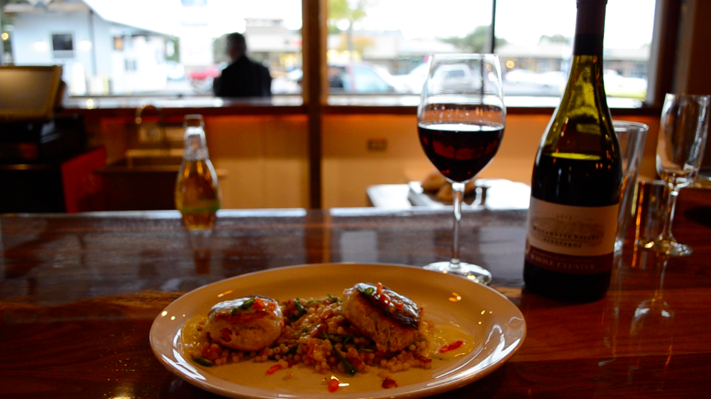 Other things to note that didn’t make it in the video is all the artwork is done by local artists — at least a couple pieces are by his wife, Patty — and the upholstered banquette that lines the side of the restaurant was designed to help break down the music, so it wouldn’t bounce off all the other hard surfaces in the room.