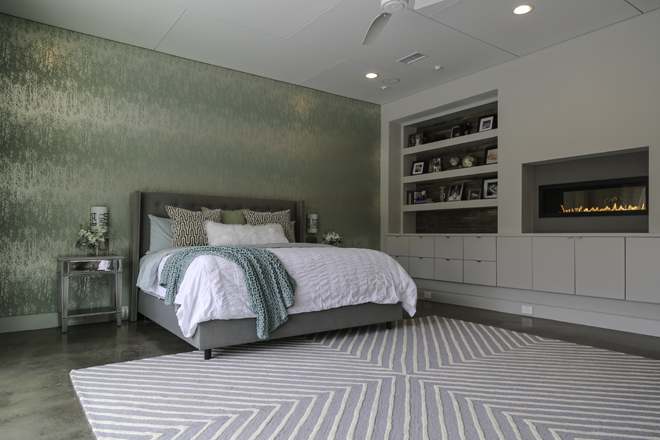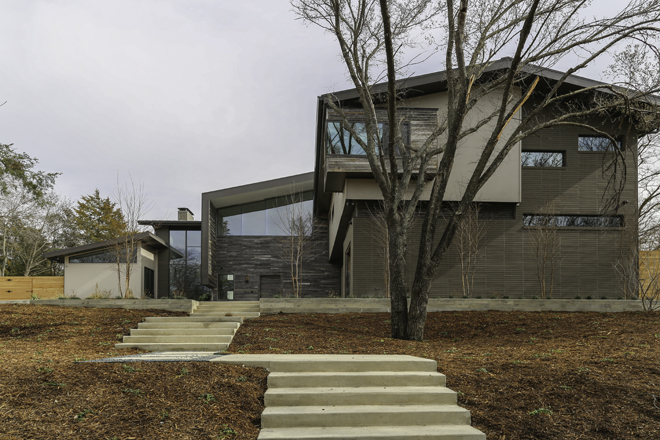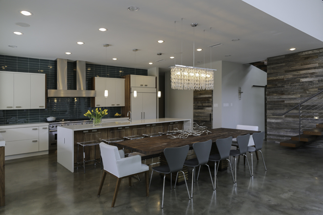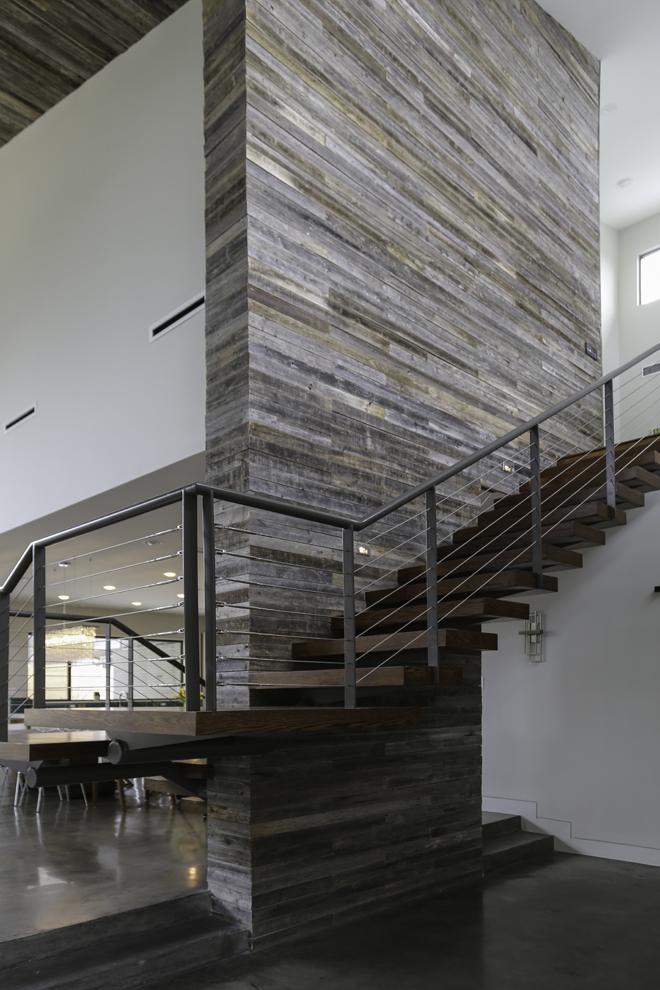 The bare wood from the home’s façade, which is salvaged and repurposed, is repeated on doors and ceiling around the home. NewLeaf’s construction practices include a focus on eco-friendly building. This home will be LEED-certified and operates on solar power, Scott notes. Melissa adds that one of her goals is to never need to turn on a light during the day. To that end, sprawling windows are strategically placed throughout.