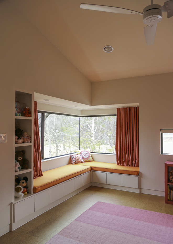 The children’s rooms, each with its own bathroom, offer bright splashes of pink, purple and orange; light-permitting windows overlooking the thick trees and rolling hills of the neighborhood; and floors made from cork.