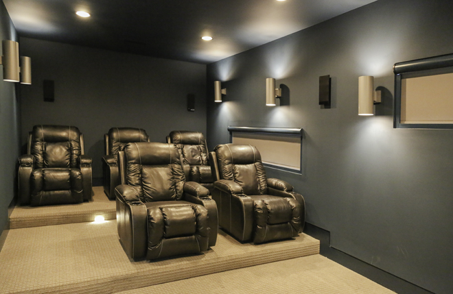 Scott and Melissa are parents to four — 6-, 4- and 2-year-olds and a 4-month-old. Ever tried going to the movies with a brood like that? Hence, they built a media room with five reclining leather seats (plus a loveseat) and a 72-inch screen (eventually Scott plans to replace it with a full-wall screen) and blackout window treatments. “We watch a lot of movies in here,” Melissa says.