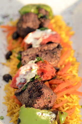 Nora’s chicken kabob is served with grilled veggies and saffron rice: Photo by Mark Davis