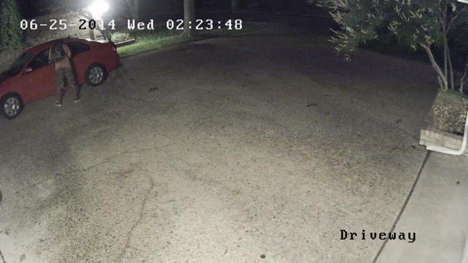 A little after 2 a.m. a man wearing a cap, long camouflaged shorts, a reddish T-shirt and a backpack casually tried the door on a car parked in the driveway. He appears to be trying to hide his face as he approaches the car. He does seem to scan the inside of the car, and might have broken a window had he seen something of value. Based on many of the police reports I have seen, these thieves usually are looking for electronics such as iPhones or computers or guns. (There are plenty of reports out there of thieves stealing guns left in cars).
