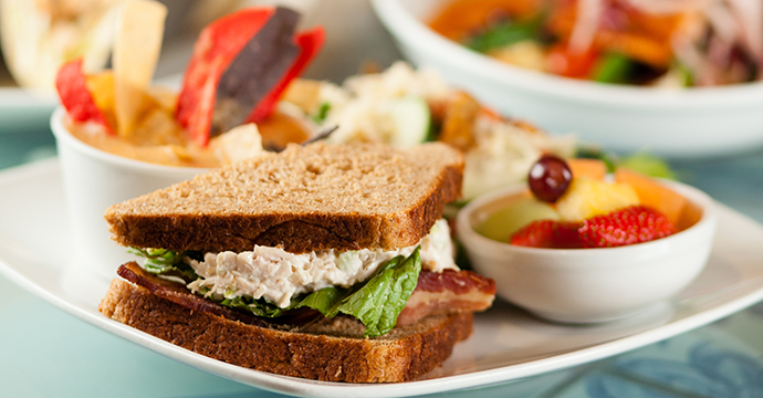 One of The Mermaid Bar’s most requested entrees, the Mermaid Sampler, features a half-sandwich with tuna, bacon and pecans, along with chicken salad, tomato soup, fruit salad and chips. Photo by Rasy Ran