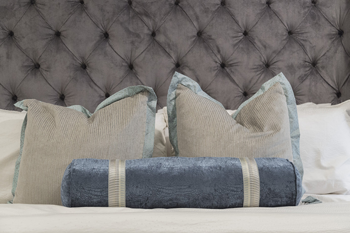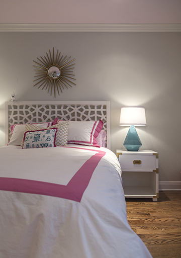 “When we were looking at design books and magazines, making plans for this house, she spotted a pink ceiling and said that’s what she wanted … the kids also get very excited about carpet,” Derek says. Taylor got the pastel pink ceiling in her bedroom; it perfectly complements whimsical designs on her walls and a velvety fuchsia headboard, which, like another unique charcoal headboard behind the master bed, is custom-made.