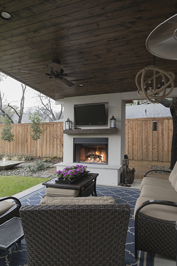 Over a period of about five months, Derek and his crew moved all but a couple of the home’s walls, raised the ceilings by two feet, and added a master bedroom, guest bedroom, and utility and mud rooms (they added about 1,500 square feet to the existing 2,700). They designed and landscaped a new backyard featuring a fireplace, television, stage, playhouse, garden and a bubbling fountain. The yard is pool-ready, Derek says, but Jenny is not sure she wants one. For now, the fountain as a water element is a compromise.