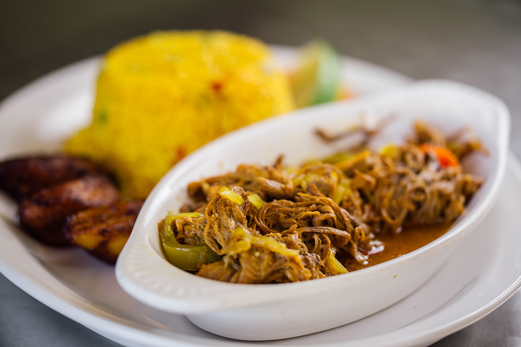 The establishment’s simple yet flavorful offerings stem from Velez’s nostalgia for his mother and grandfather’s cooking. Velez’s bestseller is ropa vieja made with lean brisket and sofrito sauce, but his favorite is arroz con puerco, or yellow rice with bites of pork in a sauce of white wine, tomatoes and spices. The pork is roasted for 11 hours every night.