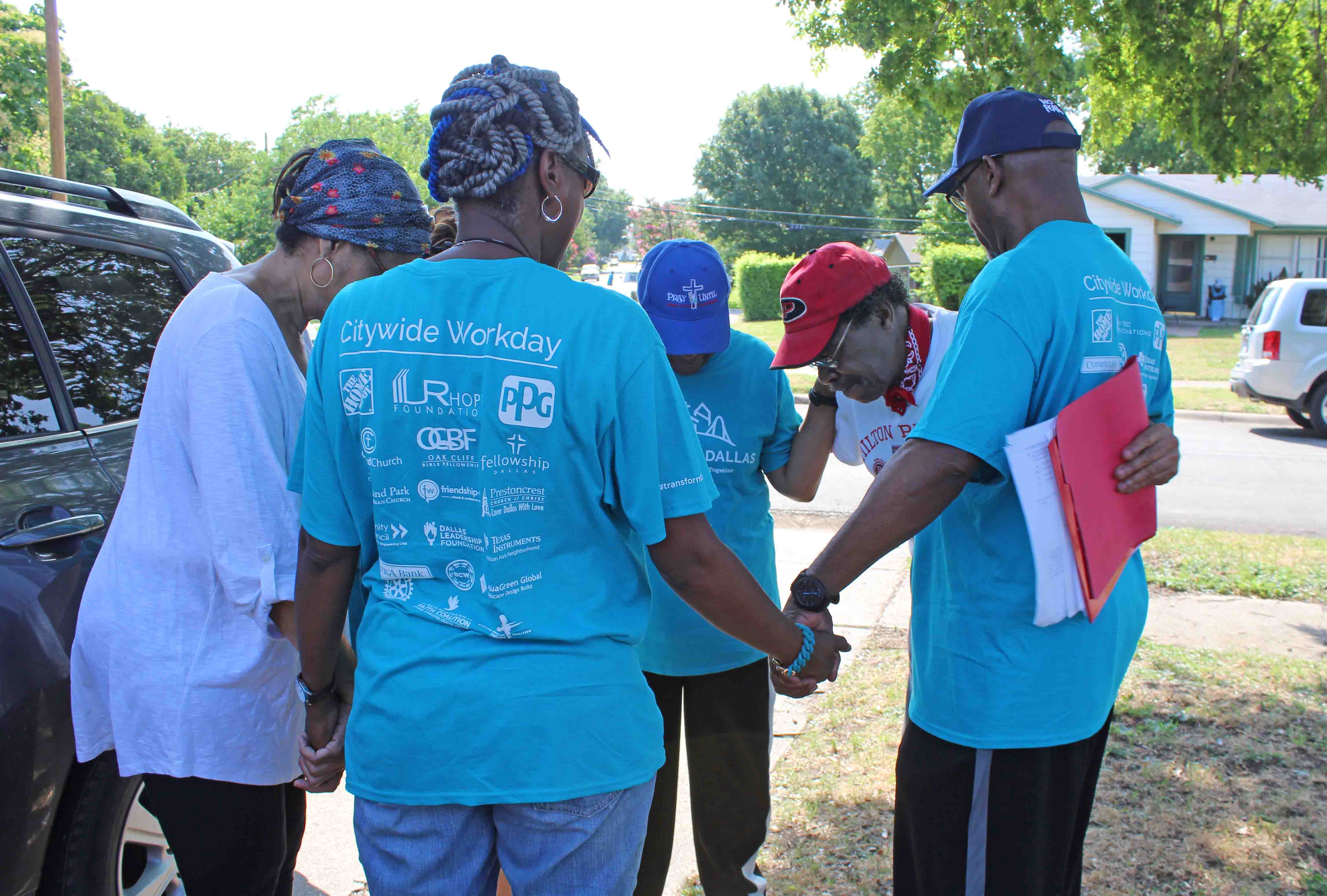 HPUMC Pastor Archie Browne (navy cap, right) prayed for homeowner Mishon Blaylock (white blouse), HP Civic League President Thomas Jefferson (red cap) and volunteers at the Transform Dallas work day Saturday.