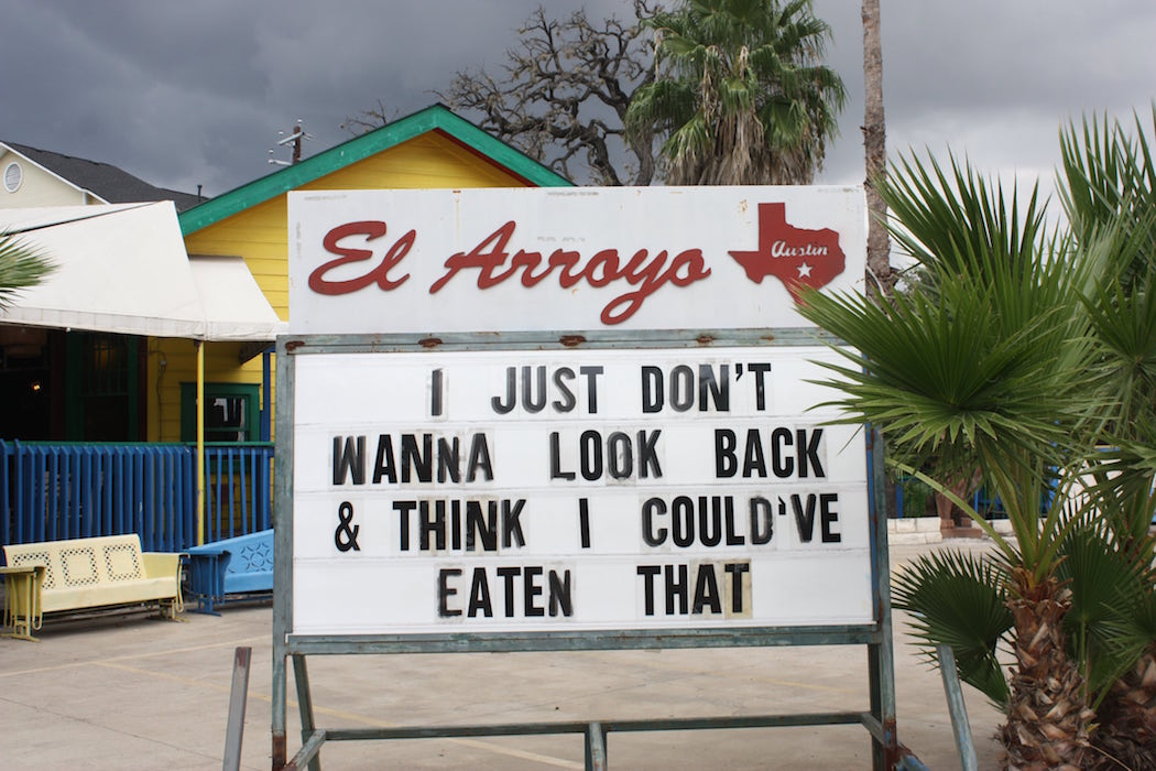 Before you roll your eyes and say, “But El Arroyo is in Austin,” let us mention that the Tex-Mex restaurant’s owner, Ellis Winstanley, is a Lake Highlands native. After buying the Austin establishment, he became one of the masterminds behind its quirky marquee. “El Arroyo’s Big Book of Signs Volume Two” features gems like “The beach gonna get whatever body I give it” and “List of People I Like. 1. Dogs.”