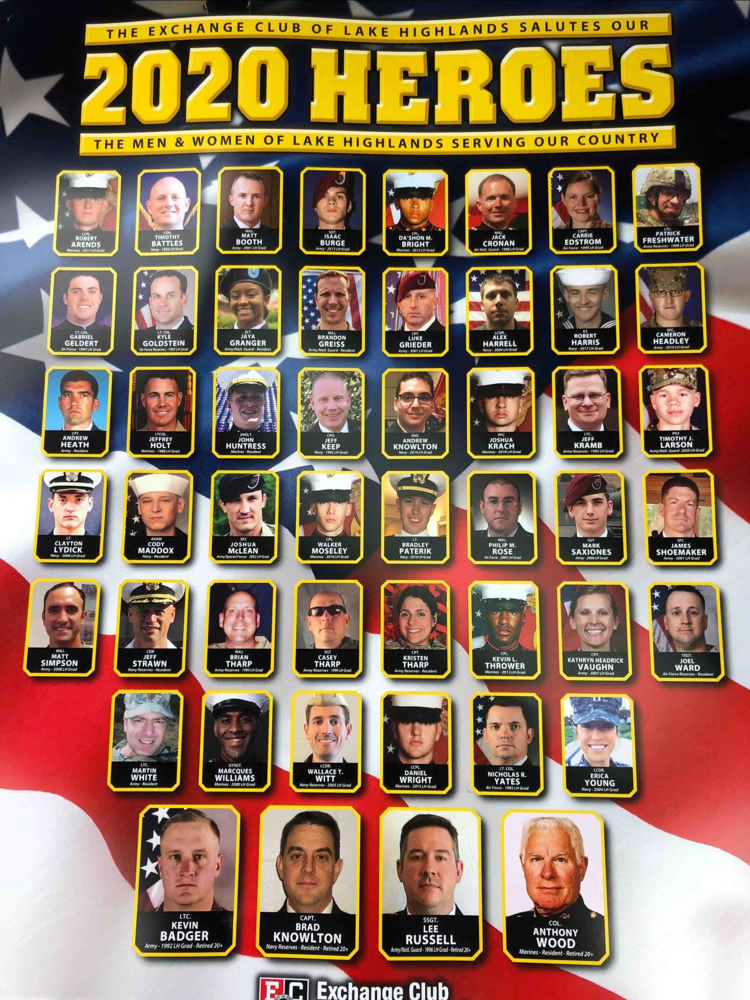 Exchange Club members got a sneak peak of the 2020 Lake Highlands Military Heroes poster at their last meeting, just before the posters are distributed to businesses around the community for display. The newest version includes 50 military members serving in various parts of the world who live in Lake Highlands, graduated from LHHS or are spouses of LHHS grads.