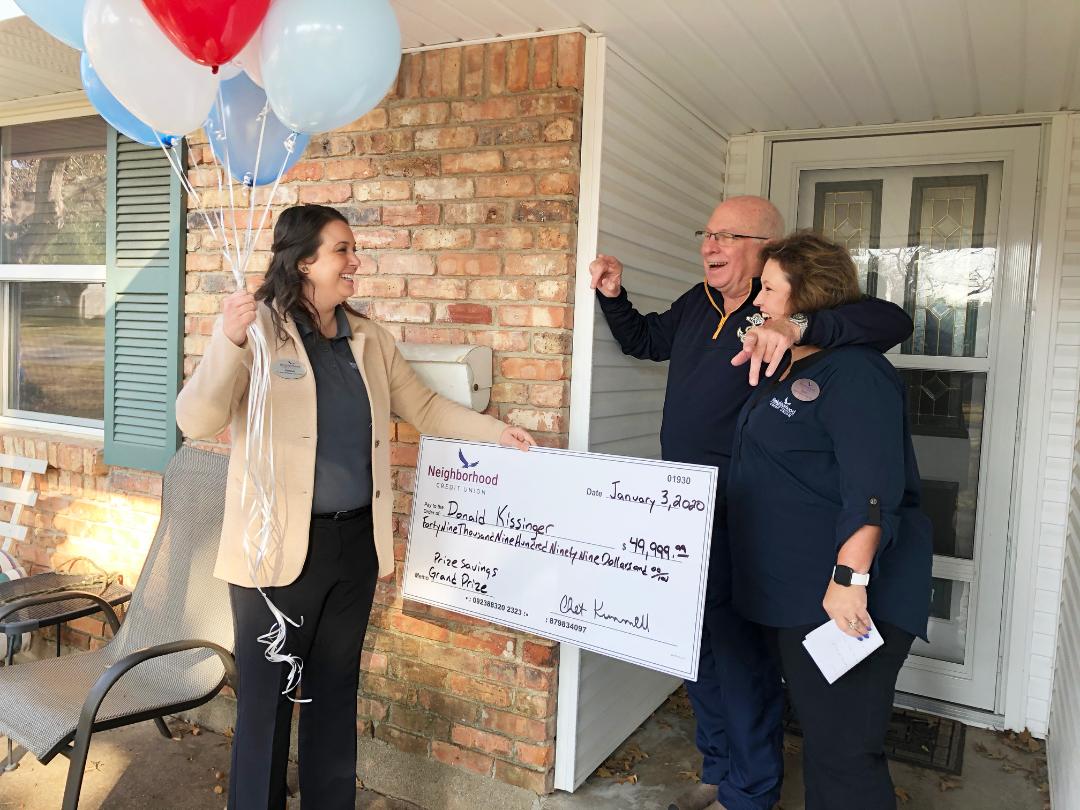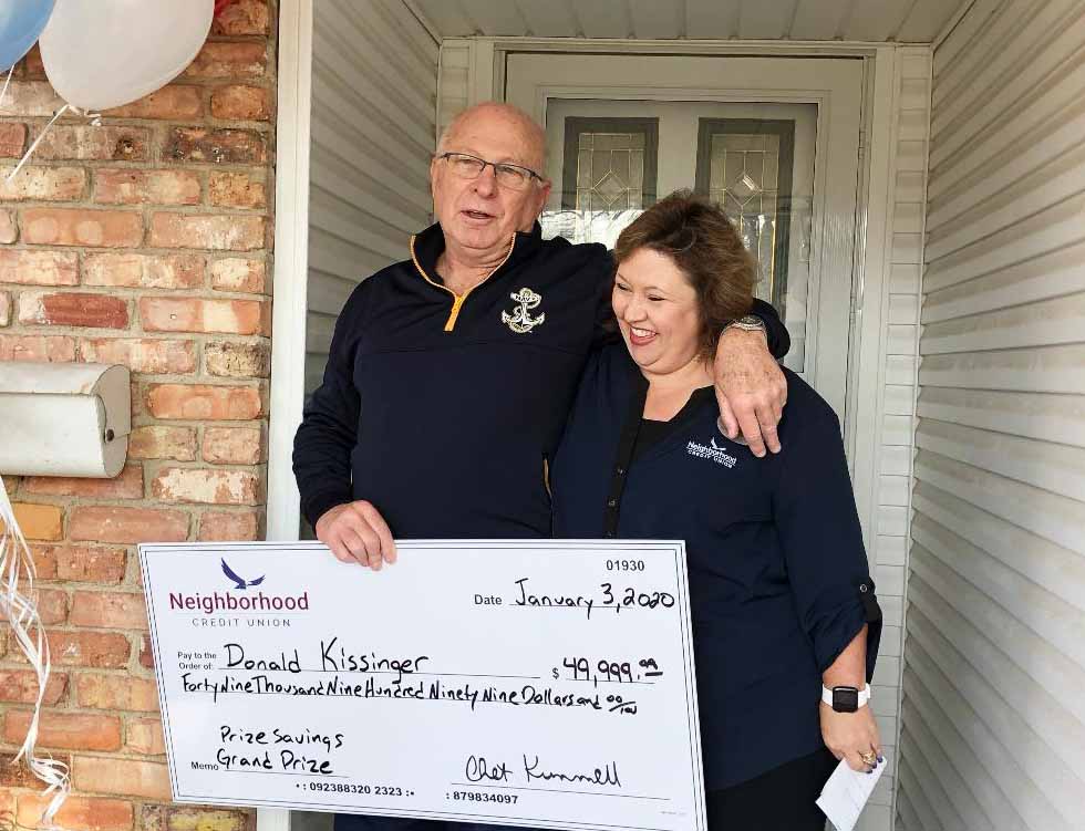 Donald Kissinger didn’t know what to expect when his doorbell rang Friday morning, but an oversized check in his name was the last thing he envisioned before he opened his front door. Staff members from Neighborhood Credit Union were on his porch to present their $49,999.99 grand prize, awarded annually after a drawing on January 1.