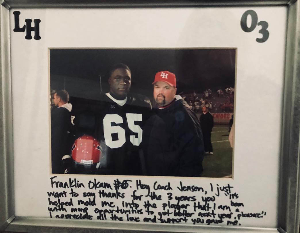 Beneath the photo: “Franklin Okam #65. Hey Coach Jensen, I just want to say thanks for the 3 years you helped mold me into the player that I am with more opportunities to get better next year. I appreciate all the love and support you have me. ‘It’s been a pleasure.'”