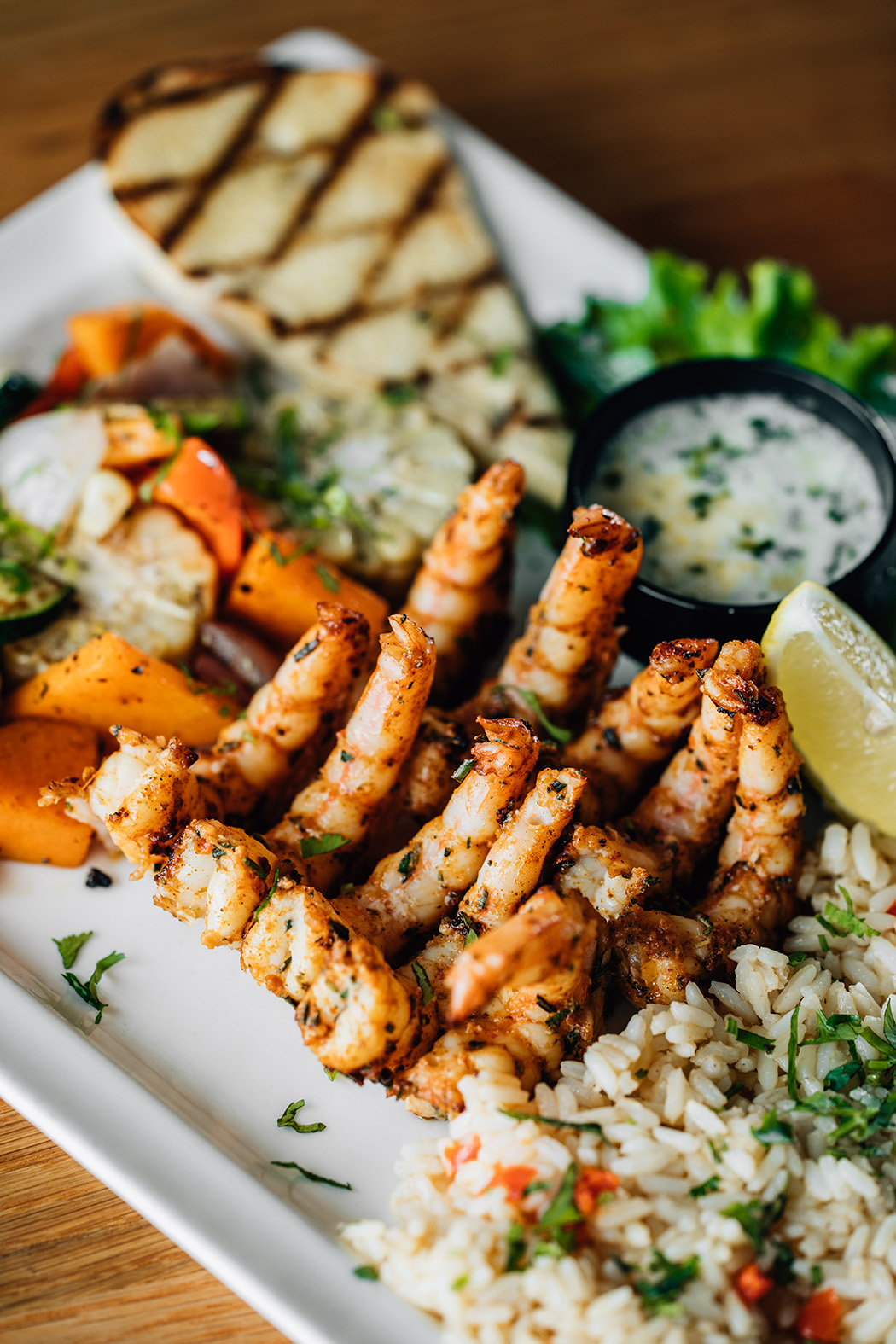 Order the Seafood Stuffed Avocado or Chilean Spiced Grilled Shrimp