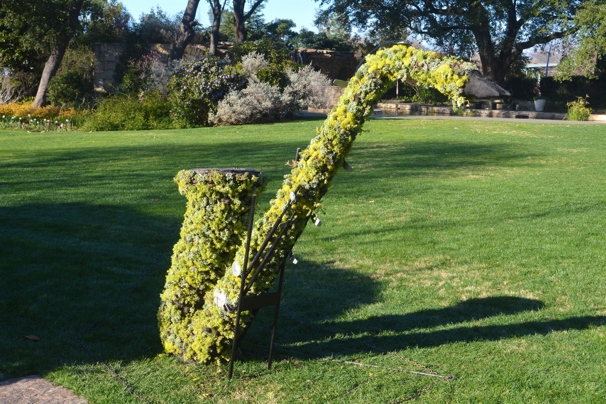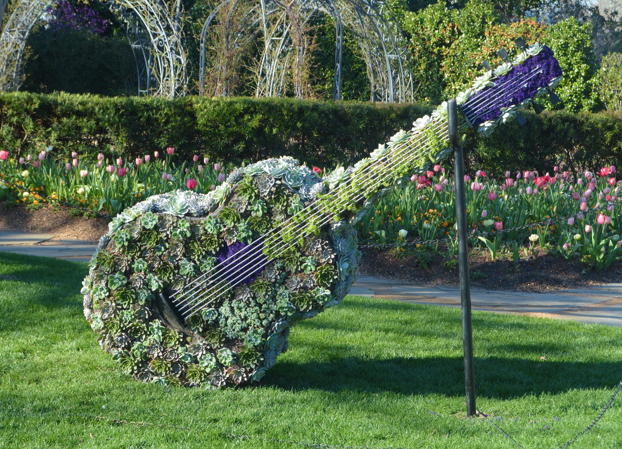 This year’s theme is the “Sounds of Spring.” Six topiaries adorn the garden, each depicting a different musical instrument, including a harp, bass, guitar and saxophone, as well as two topiary musicians. One musician is playing the violin, the other is playing the piano.