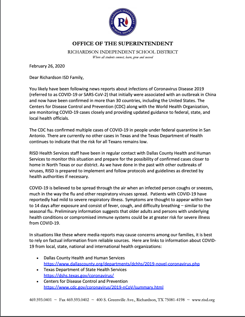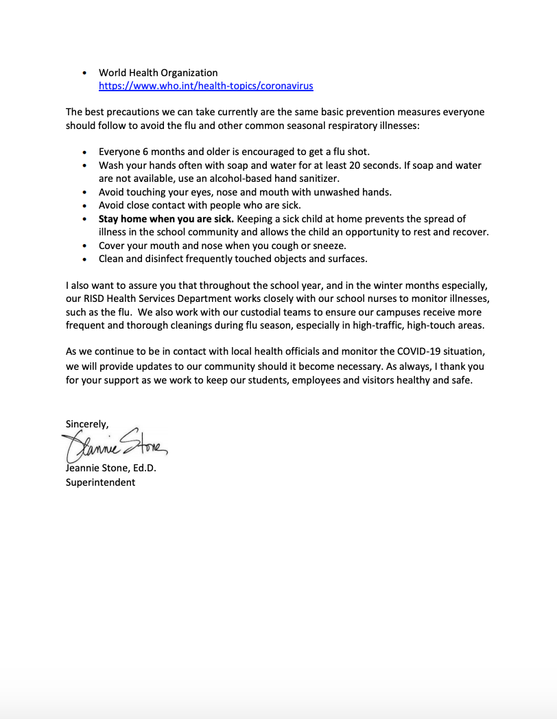 The district sent a letter to parents last week. RISD also has a preparedness website for coronavirus (COVID-19) here.