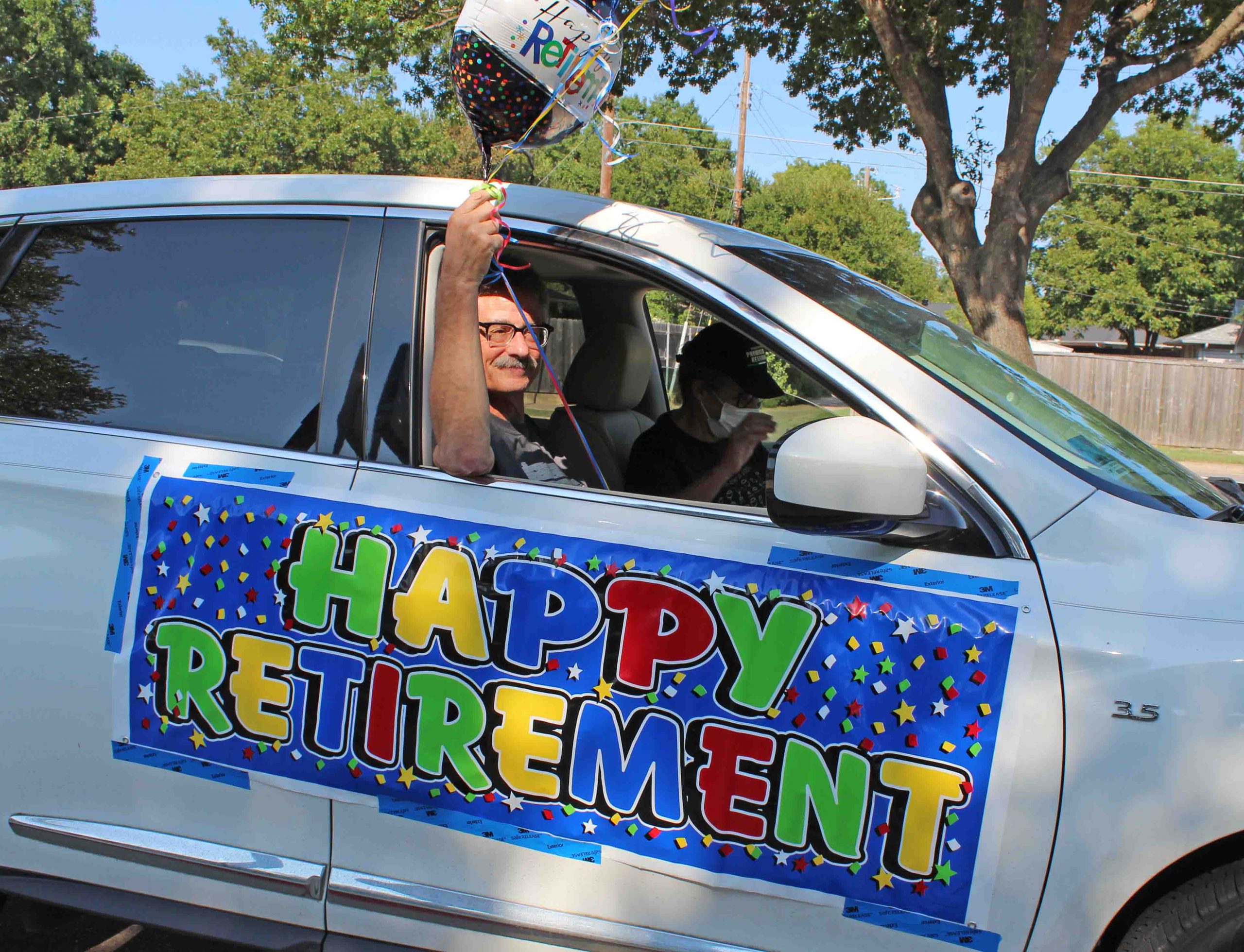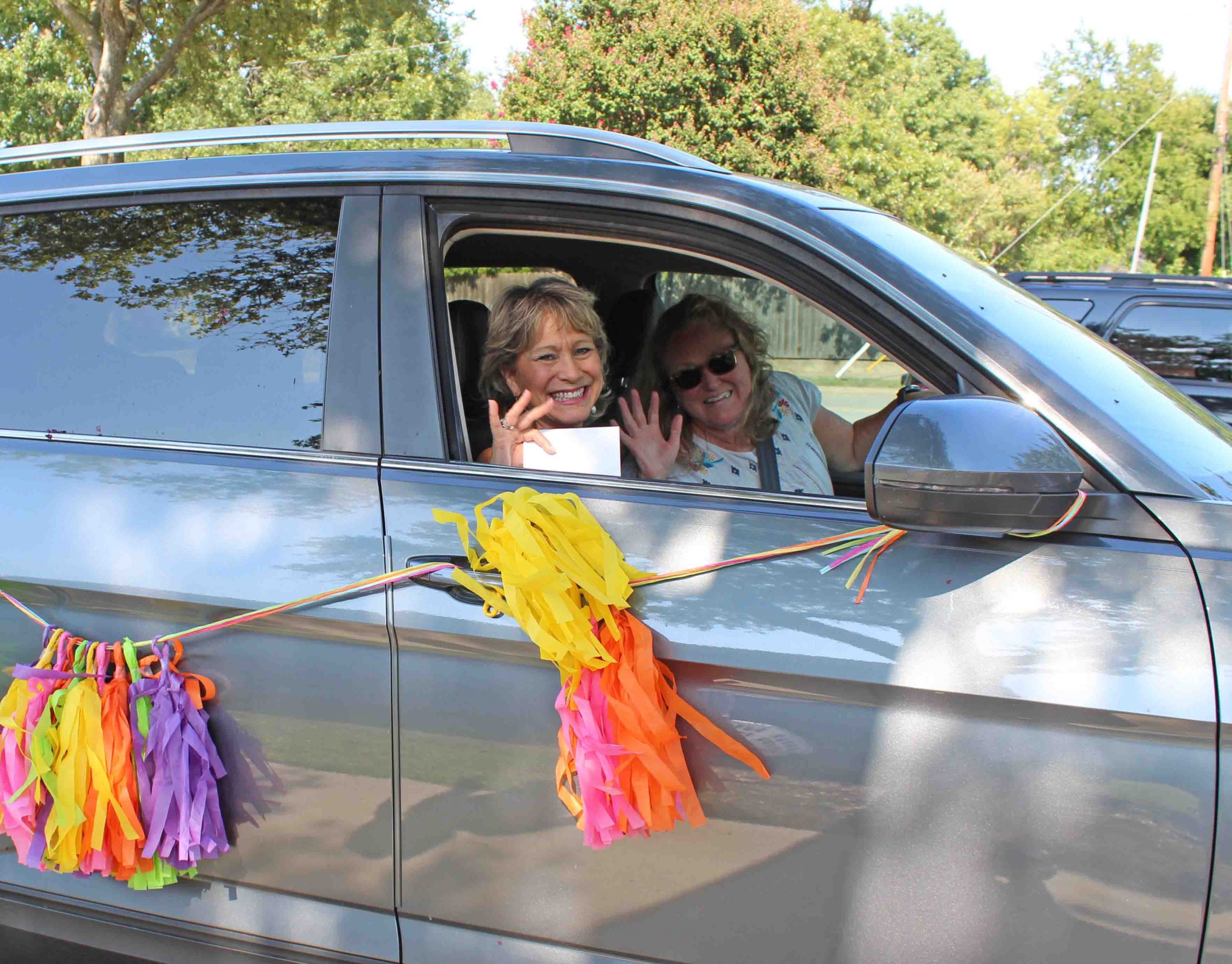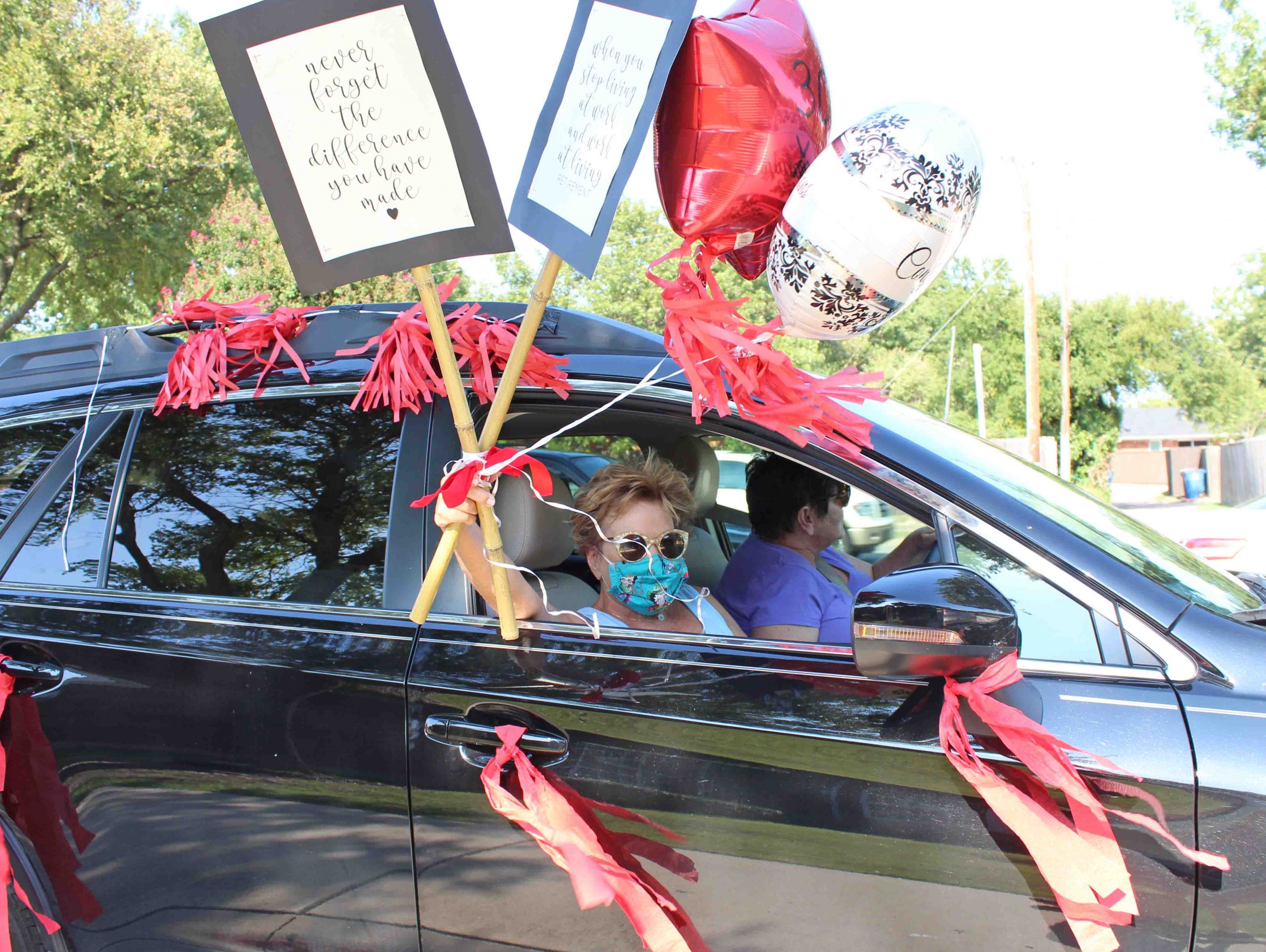 Admiring families decorated their cars with balloons, tassels and hand-stenciled signs to profess their devotion and wish their teacher “happy trails.”
