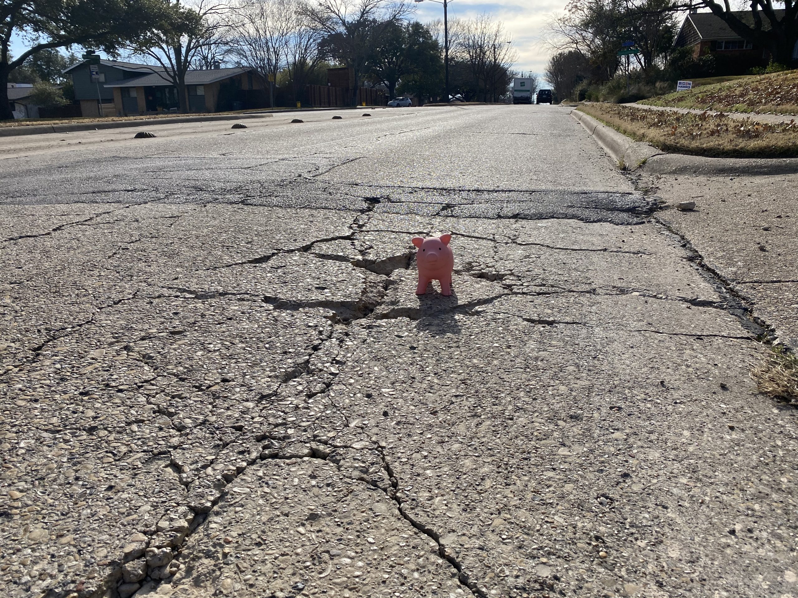 Porky reported these potholes to the City of Dallas’ 311 online portal. The report number is 21-00038642 if you want to follow along. The estimated response time is three days, with a service followup five days later. We’re watching to see if it gets fixed.