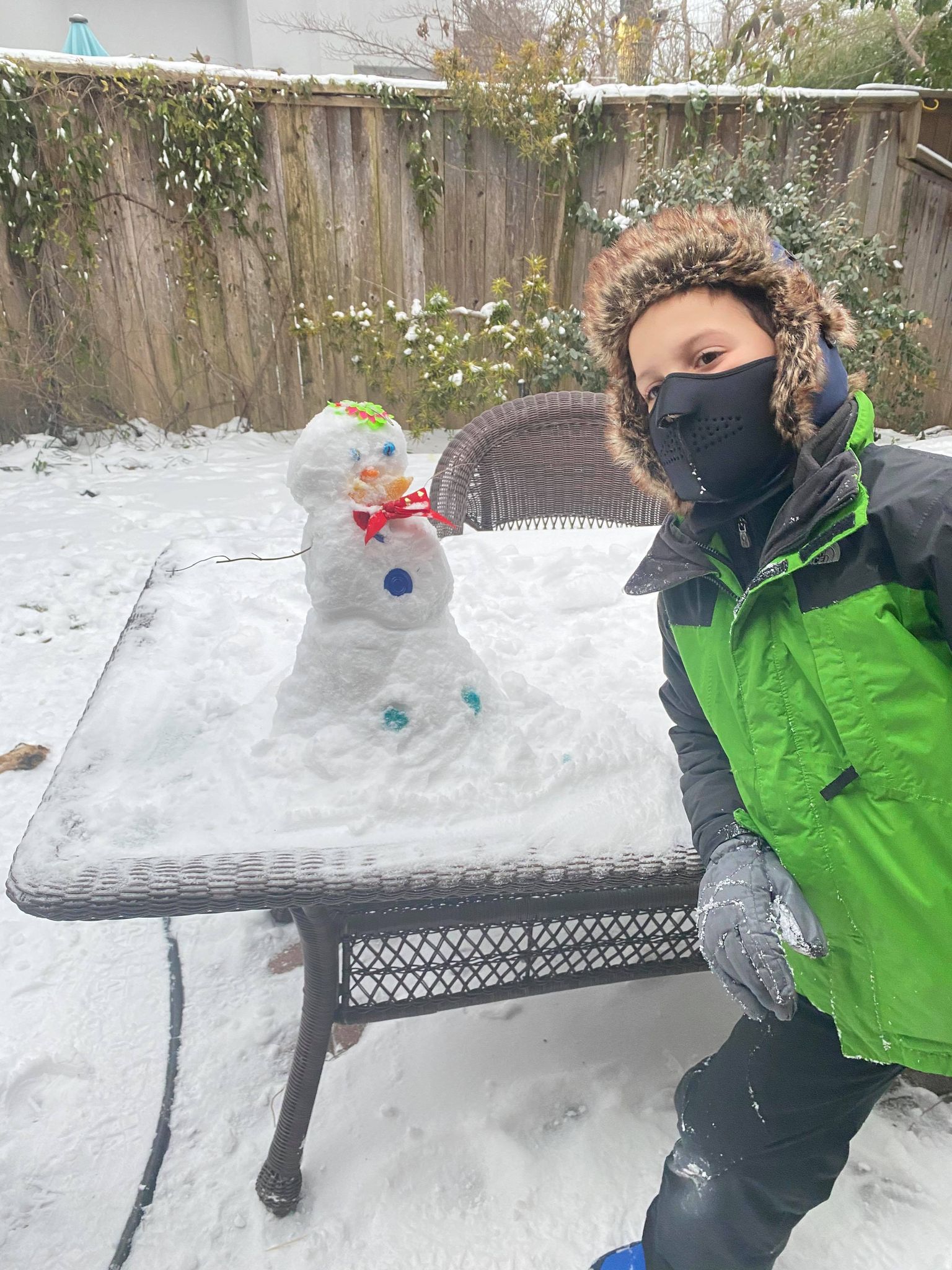 - 9-year-old Jude Smeltz builds a snow woman. Photo courtesy Toni Arrant