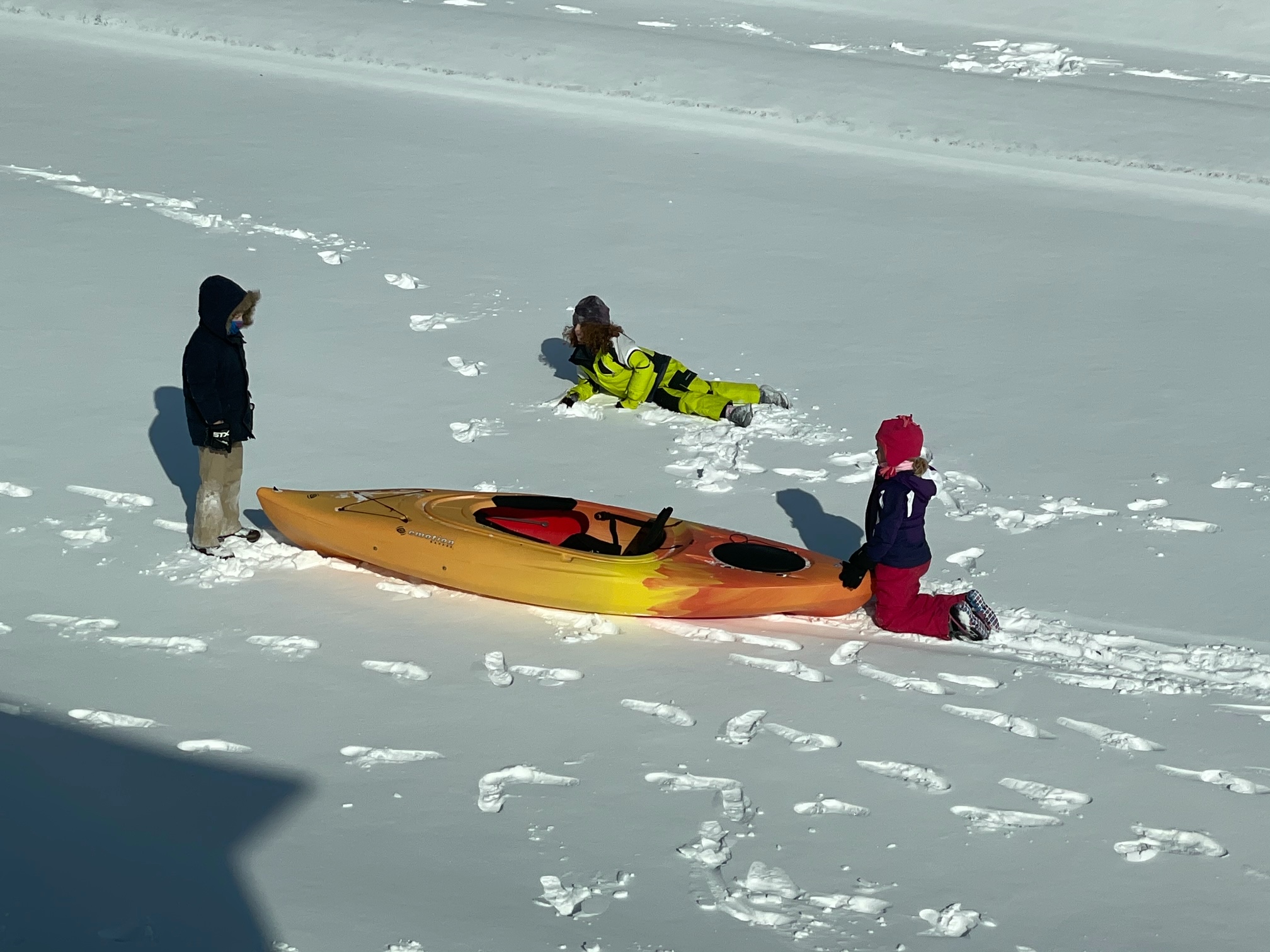 - There were no sleds available, so some kids at Vintage Oaks Court tried snow kayaking. Photo courtesy