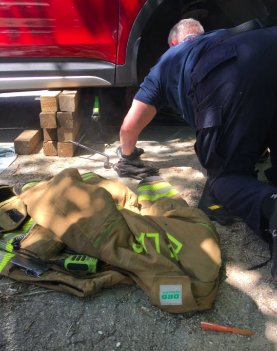 A stray dog that was trapped under an SUV has a new home with one of the firefighters who rescued her.