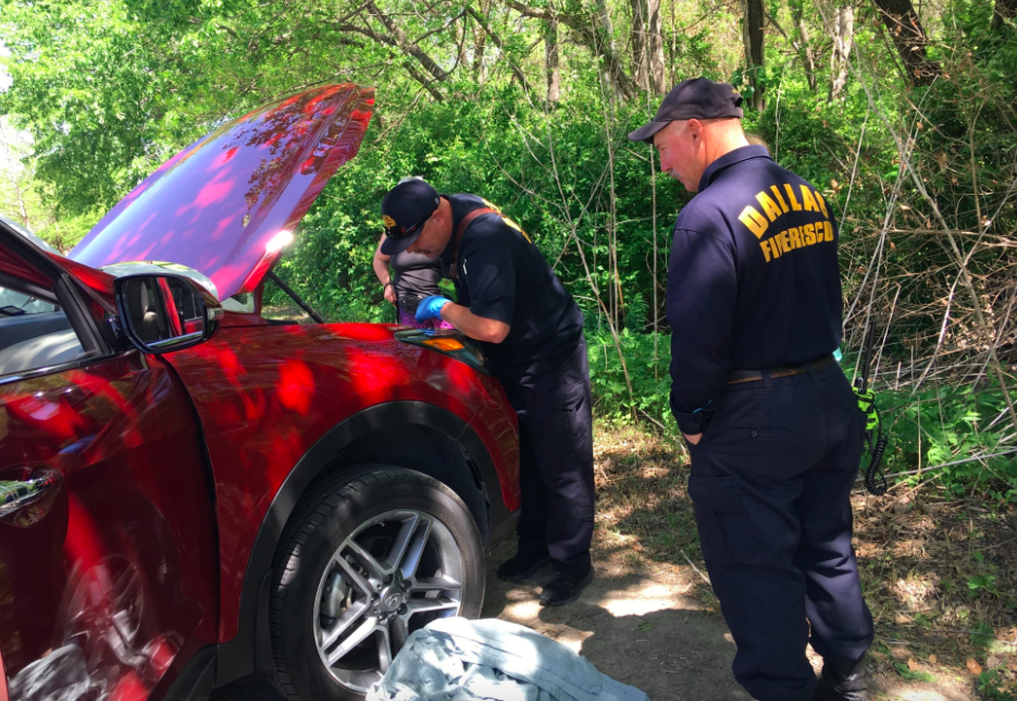They removed one of the tires on the SUV so they could access the dog from the top and bottom of the engine compartment. Once she was rescued, she was transferred to Dallas Animal Services and Adoption Center.