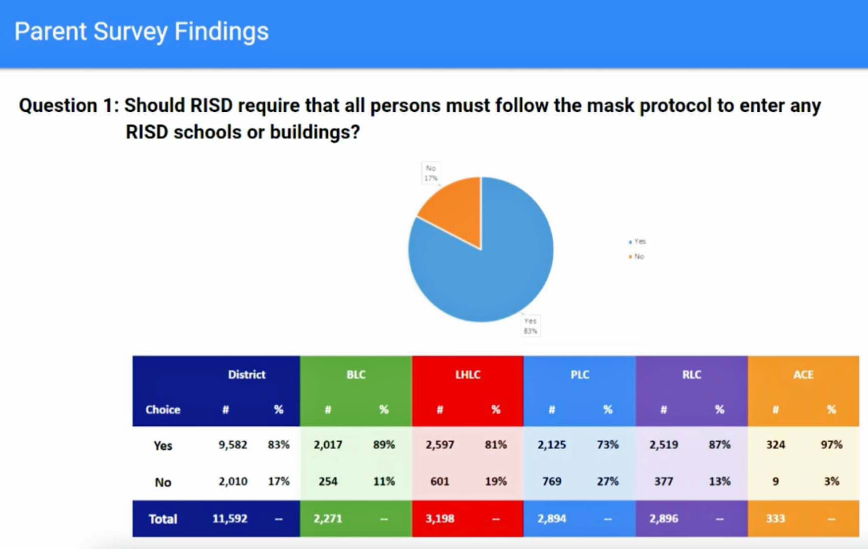 When asked if RISD should require that all persons follow the mask protocol to enter schools and buildings, 83% of parents and 77% of staff said yes. About 81% of parents in the Lake Highlands learning community said yes.