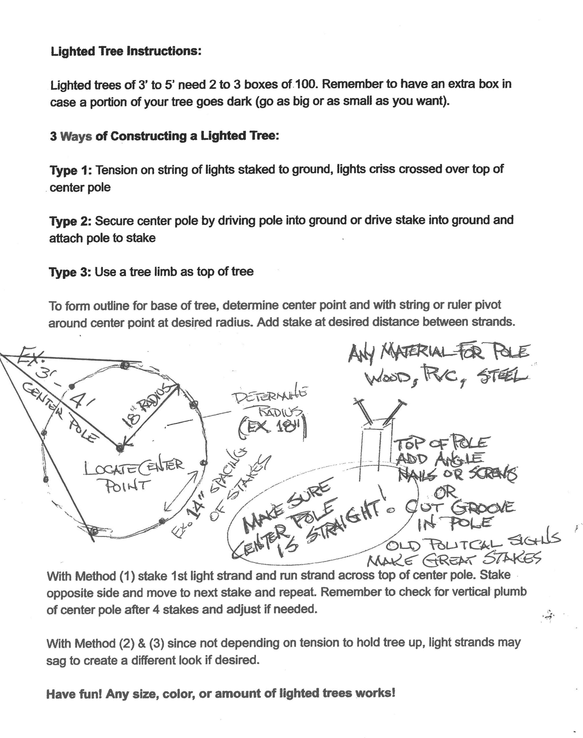 When you’re ready to load your family into the car and see the lights of Lake Highlands, be sure to check out the many lighted trees fanning out from Caribou Trail and Church Road. Last year we shared John Henton’s effort to encourage his neighbors to build the trees in their yards, and this year even more homeowners are joining in – especially with colored lights. You’ll find instructions for building the trees below.
