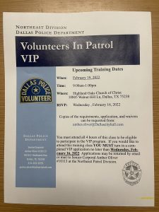 The Northeast Division Neighborhood Police Unit will host a four-hour Volunteers in Patrol class on Feb. 19.