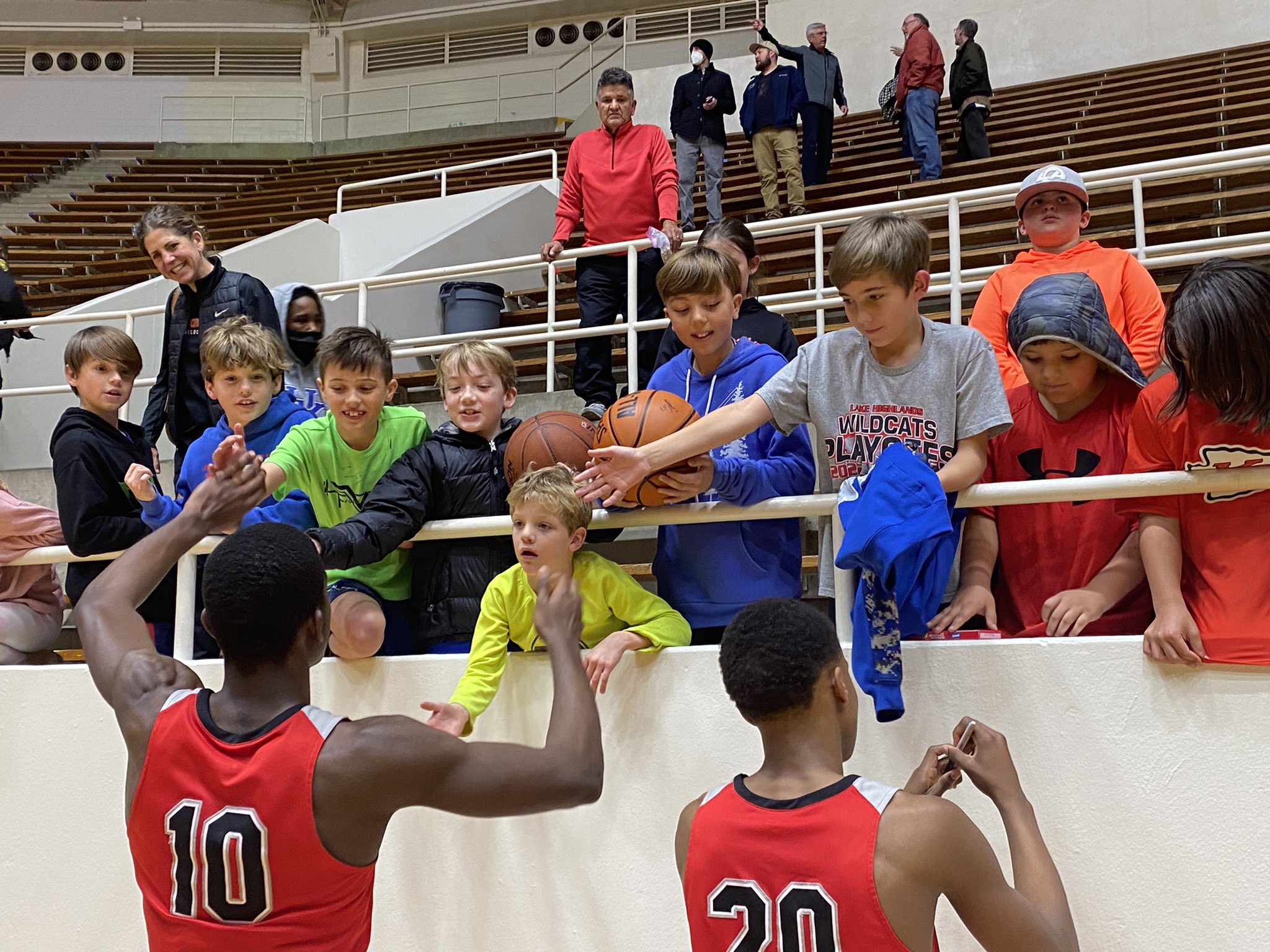 Samson Aletan (10) and Tre Johnson (20) chat with fans after the game.