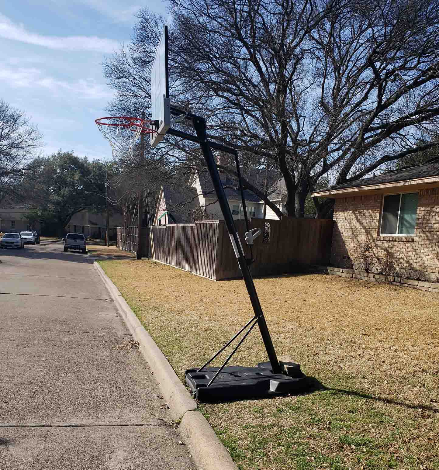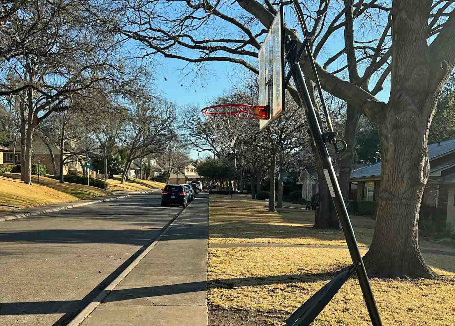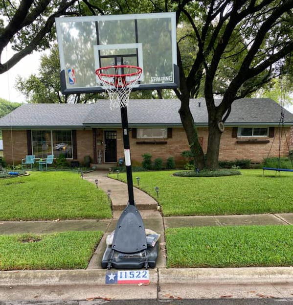 Jenkins says his family lives on a street with a steep back driveway, so positioning the rolling goal behind the house just won’t work. One son plays basketball for Lake Highlands Junior High, and his boys are out there all the time with friends and neighbors. He sees lots of other goals in front of houses as he walks his dog and says it’s a shame they may all have to be taken down.