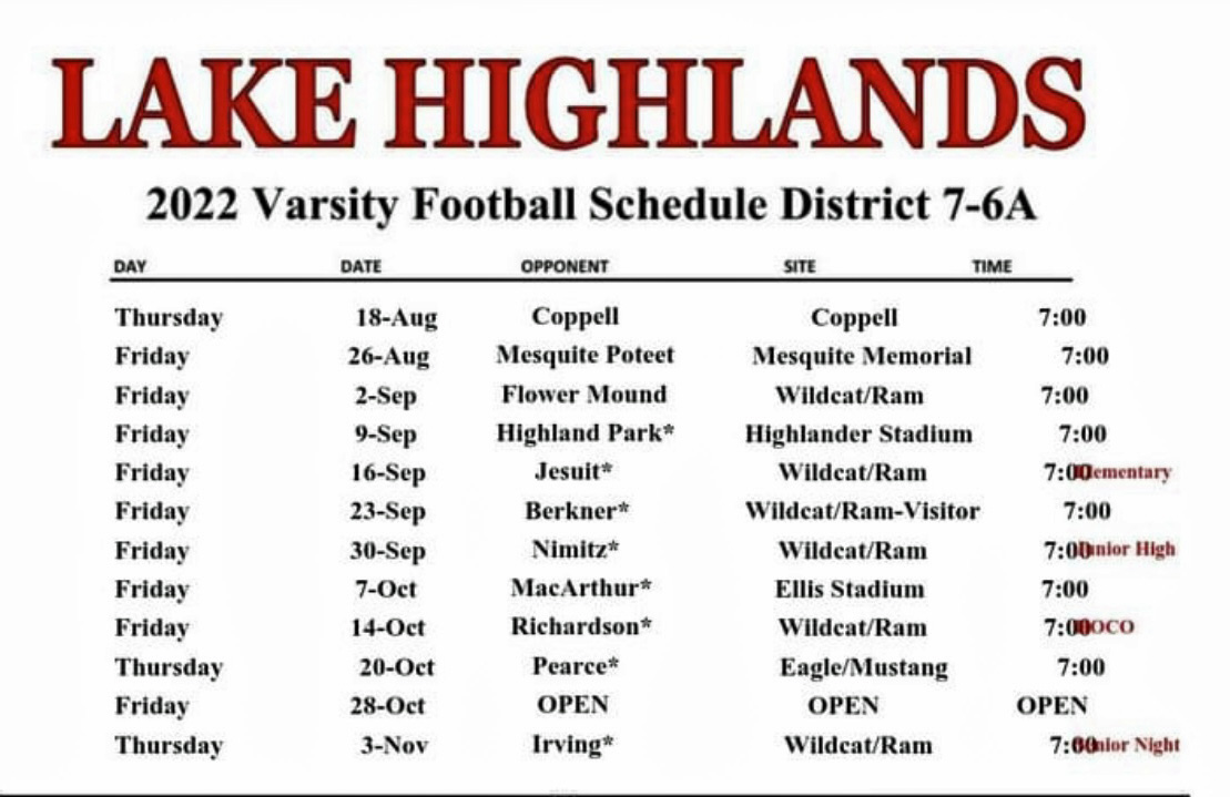 It’s never too early to think about football in Lake Highlands, Texas, and Wildcats are already there. The fall schedule is out, and the Cats will begin with a scrimmage in Coppell Aug. 18 and kick off the season Aug. 26 in Mesquite against Poteet. Our home opener will be Sept. 2 against Flower Mound, and our district opener will be against new district foe Highland Park on their home turf.