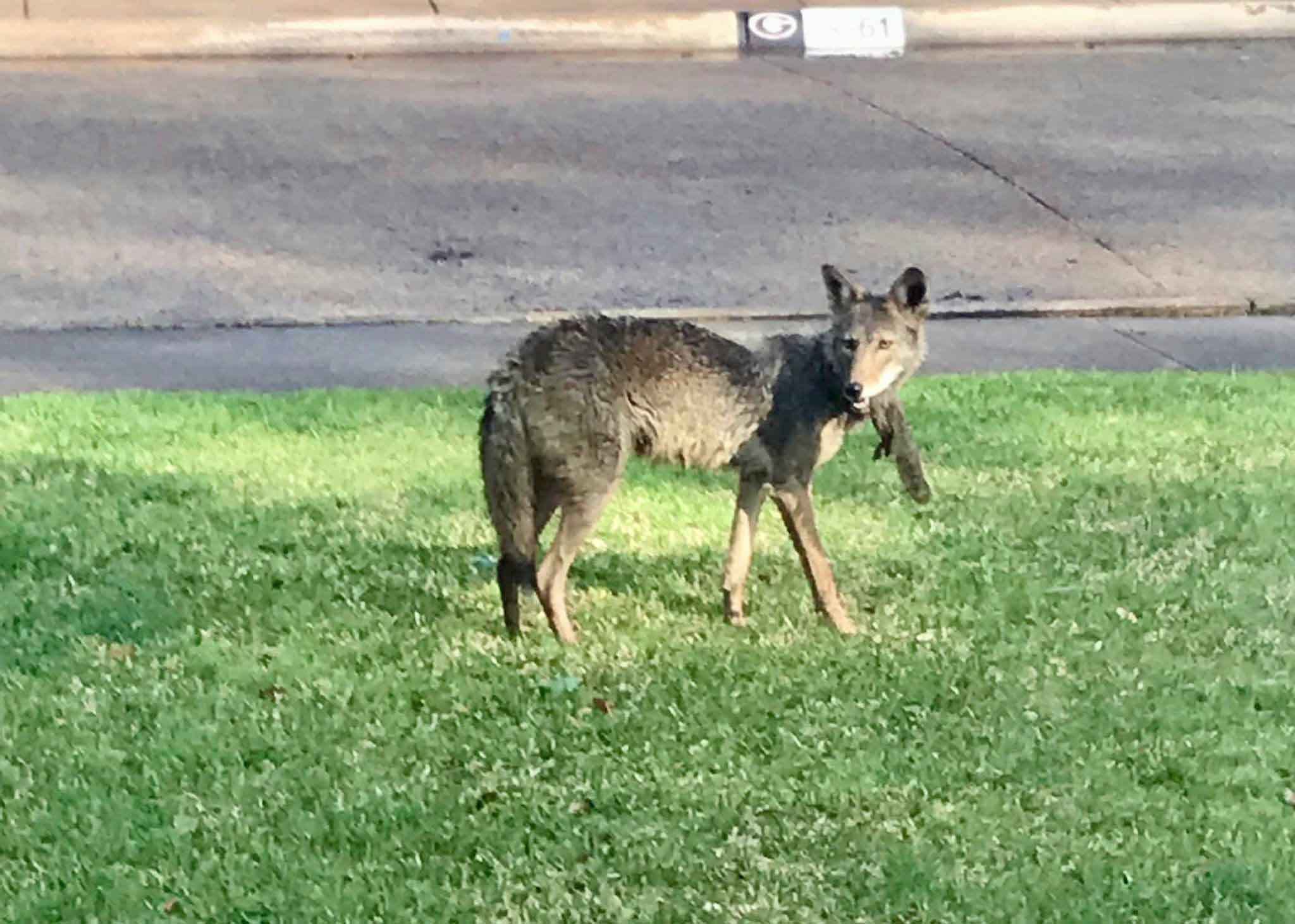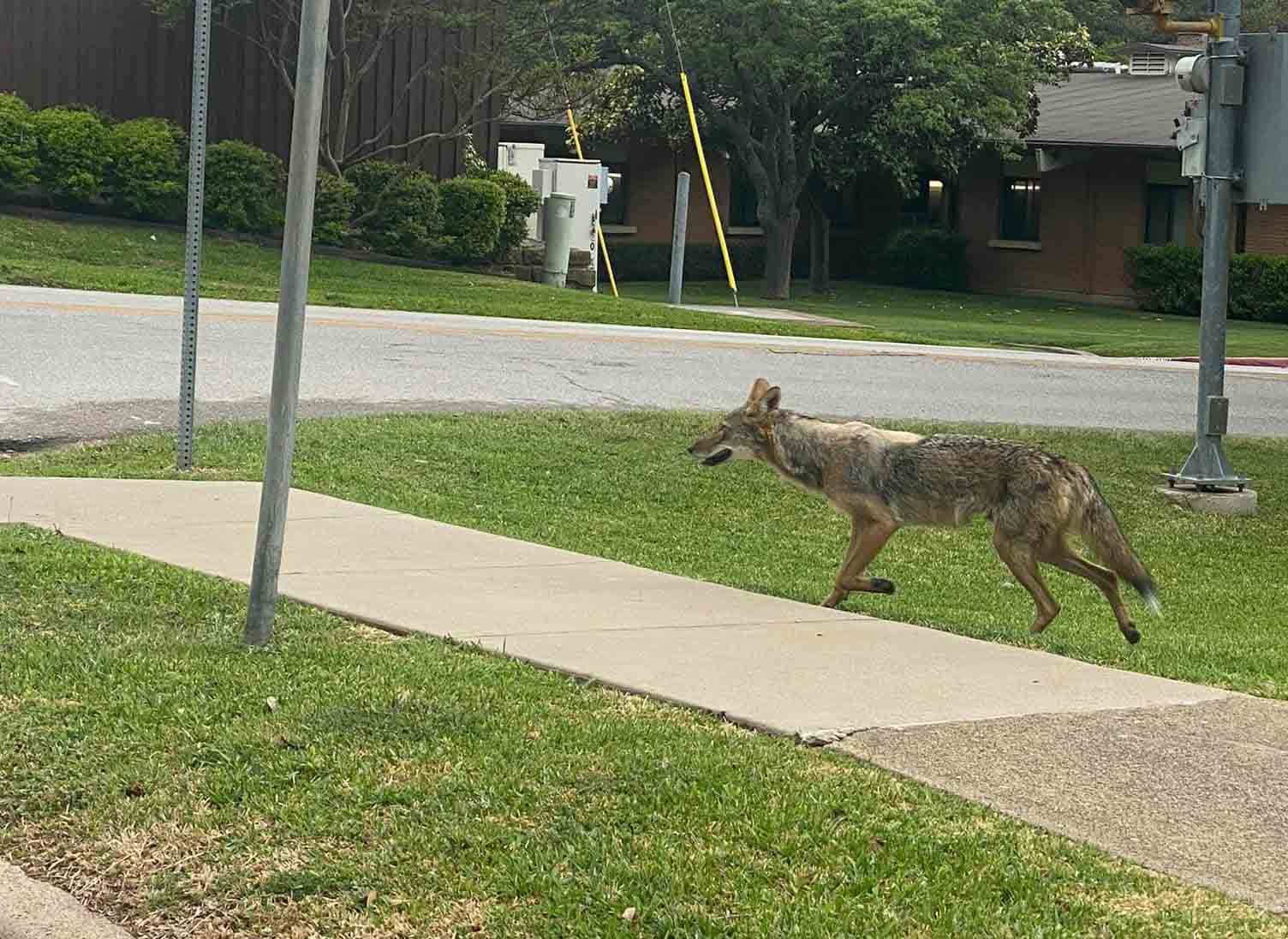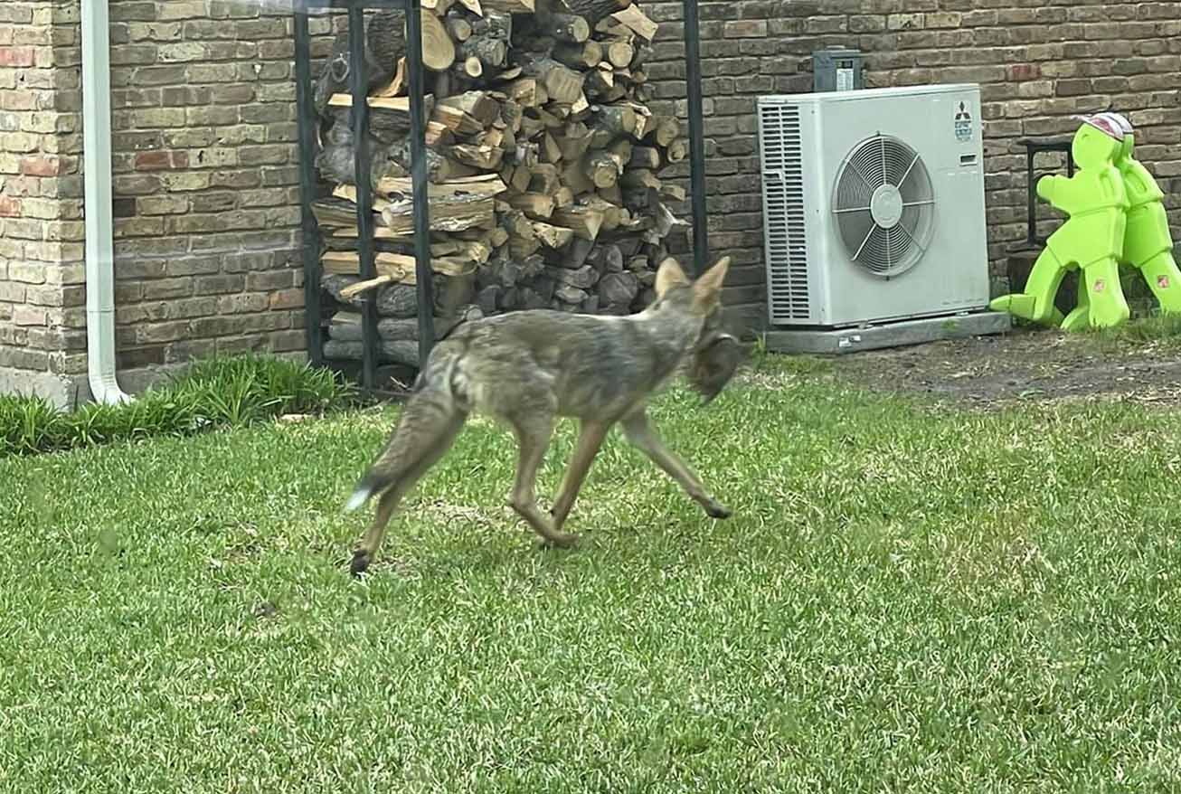 Responding officers shot at the animal, which ran off into a nearby wooded area but returned a few times according to witnesses. Texas Game Warden patrols are still in the area attempting to capture the coyote, but have been unsuccessful so far. Authorities are advising homeowners to keep their pets and young children indoors until the situation is resolved.