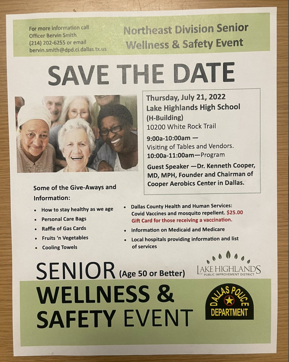 A week later, on July 21, there will be a senior wellness and safety event for neighbors age 50 and over. This event will be from 9 – 11 a.m. at Lake Highlands High School. Dr. Kenneth, founder of Cooper Aerobics Center, will be the guest speaker.