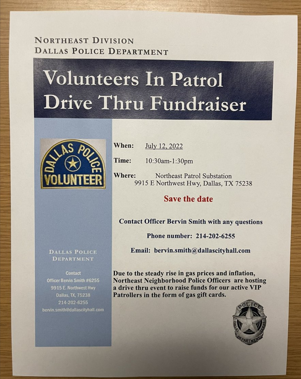 The first one is coming up on July 12 and is a Volunteers In Patrol (V.I.P.) drive-thru fundraiser. It will be from 10:30 a.m. – 1:30 p.m. and take place at the Northeast Patrol Substation on 9915 Northwest Hwy.