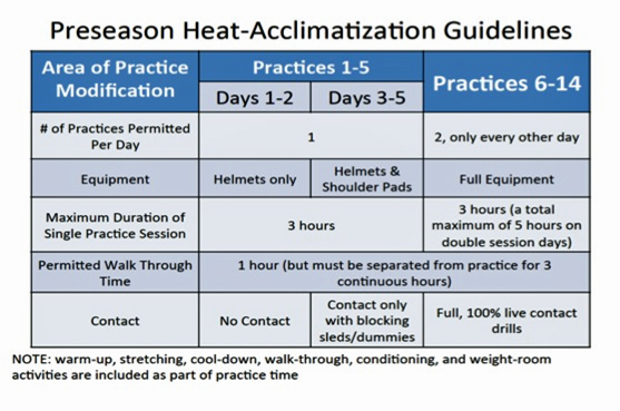“One easy thing we do to reduce the risk of heat illness is to limit the amount of time we are outside. We do all pre-workout things inside like meetings, walk throughs, stretching and conditioning. We don’t have practices in the heat of the day. Try to workout early in the morning or in the evening. Also, listen to your body and know the warning signs of heat illness. If you don’t feel well, stop and go inside to cool off.”