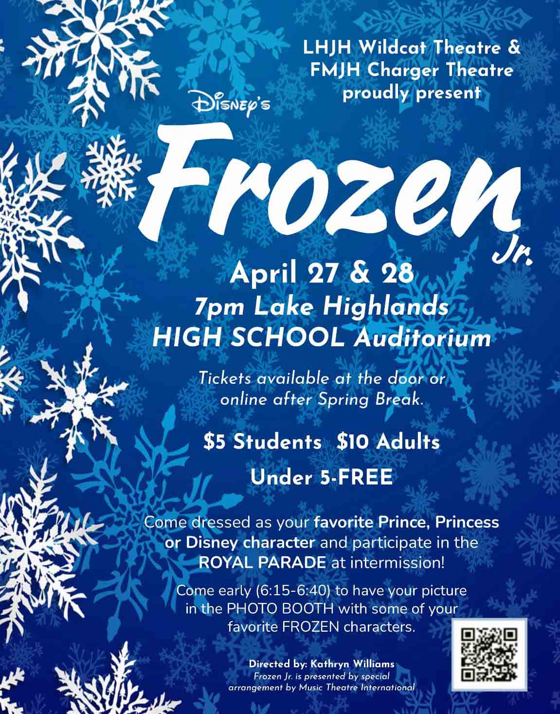 The curtain goes up at 7 p.m. Thursday and Friday on the big stage at the Lake Highlands High School auditorium. Tickets may be purchased at the door or via the QR code on the poster. Adults pay $10 and students pay $5.