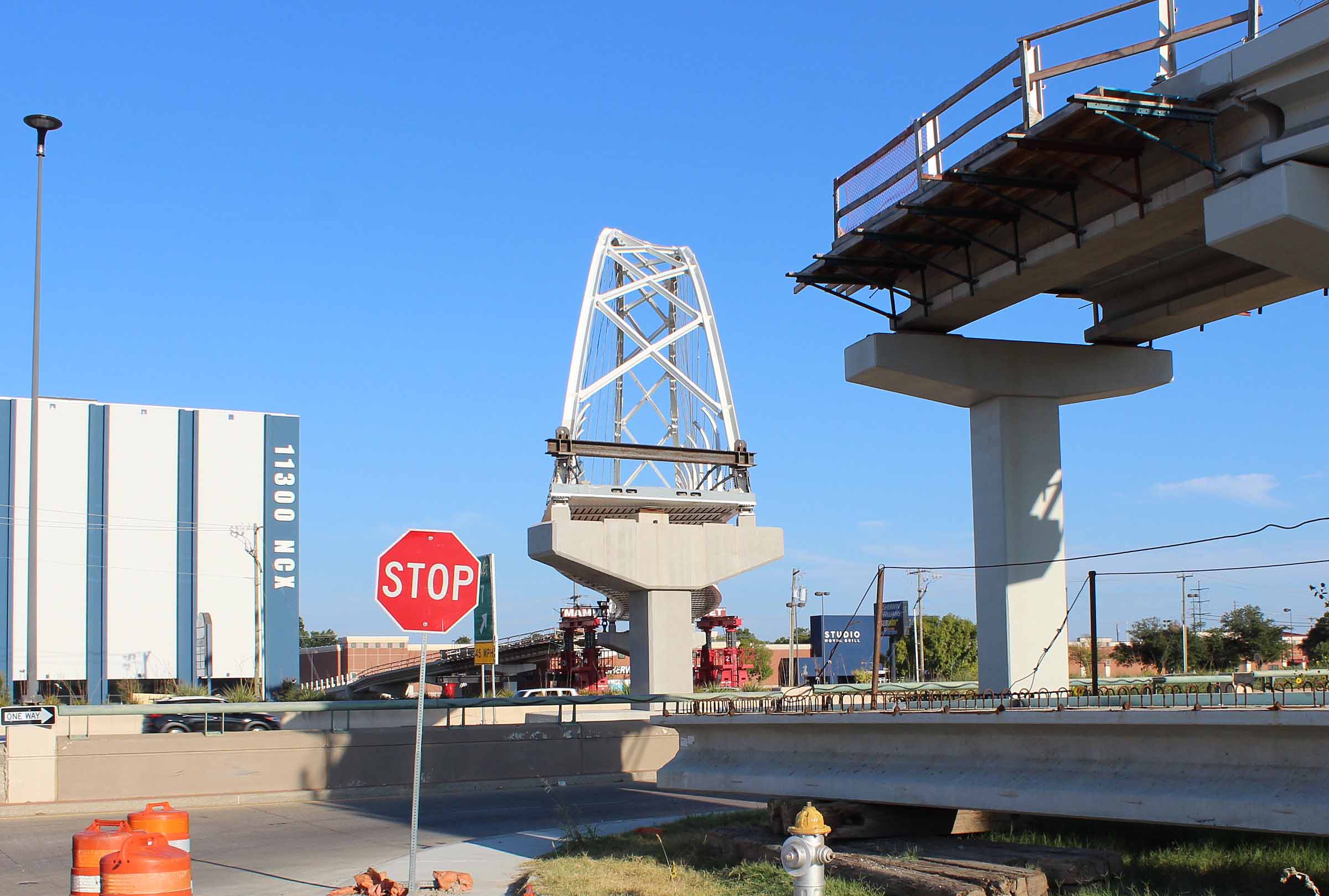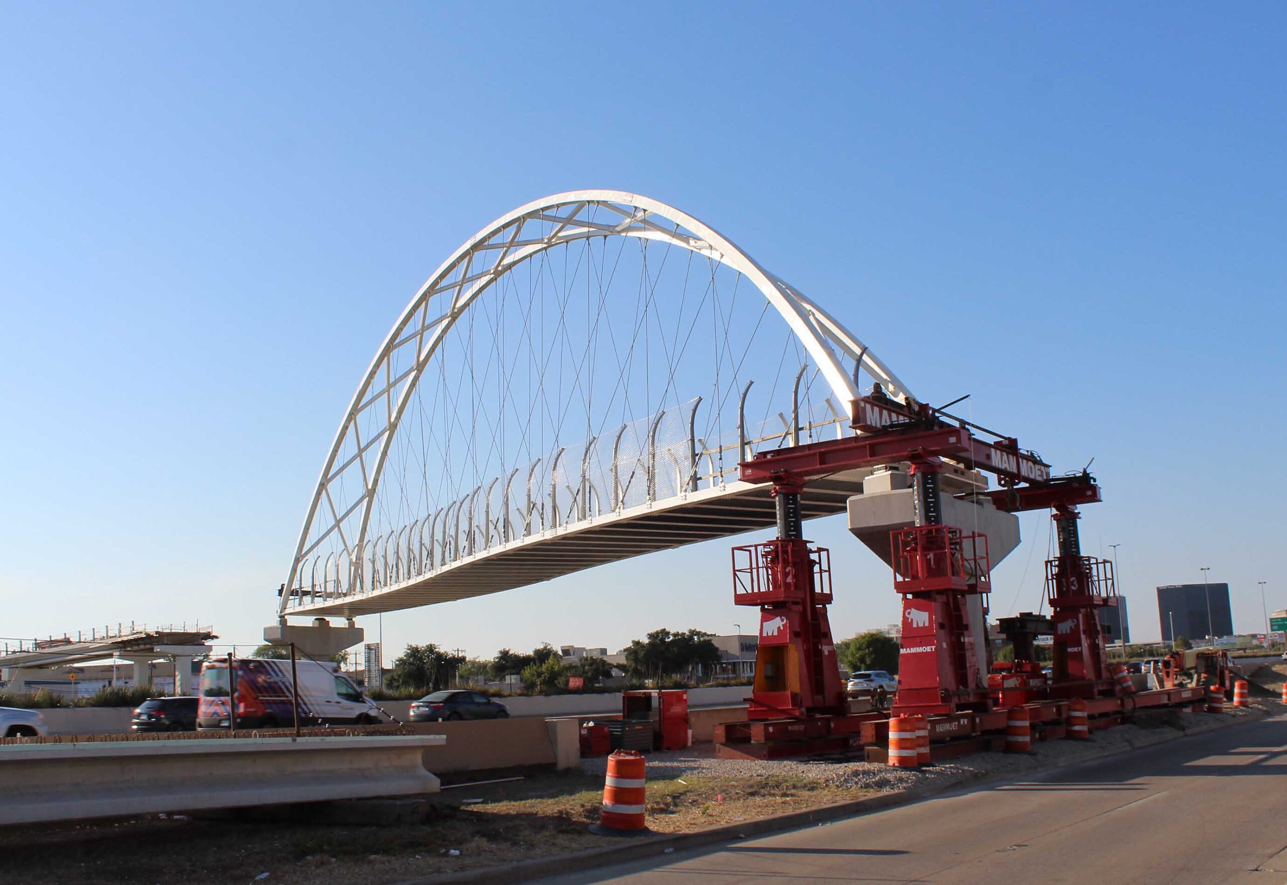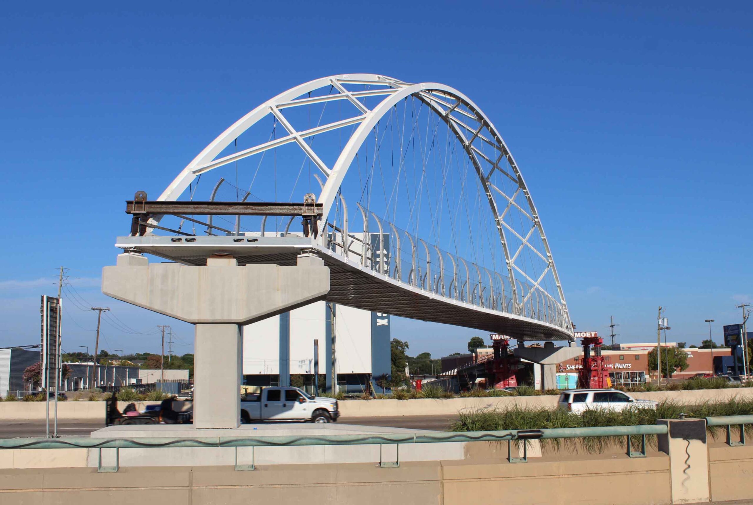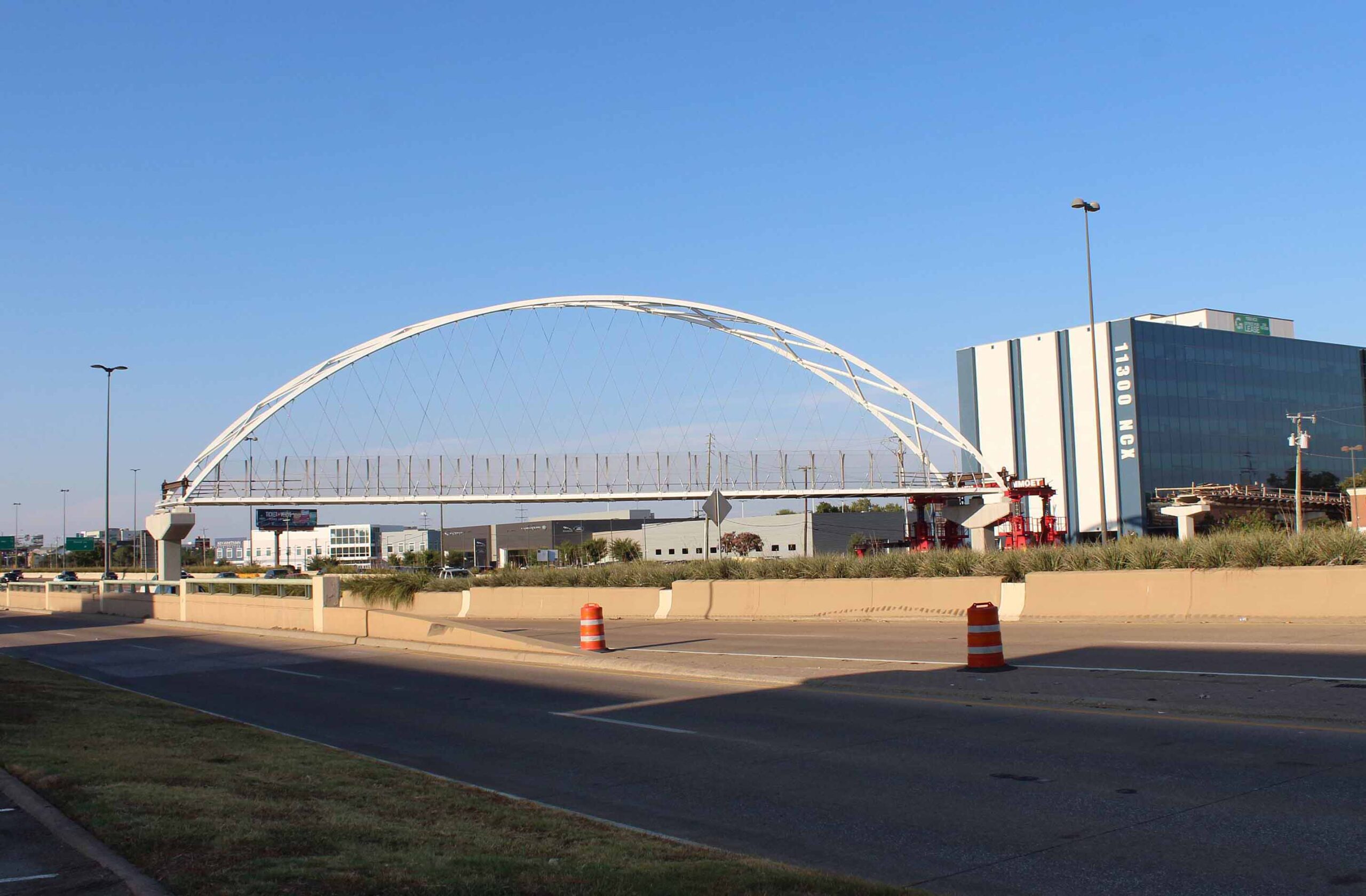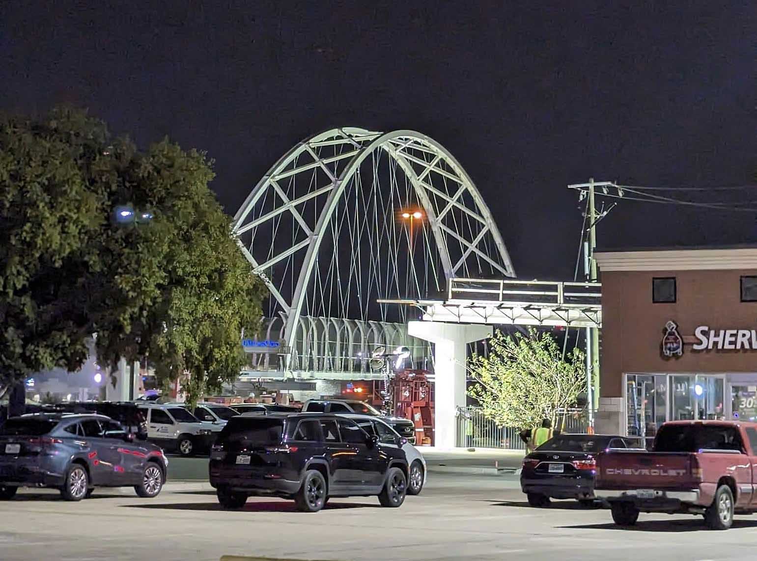 US 75 is open today after a planned weekend closure allowed construction crews to place the new Northaven Trail Bridge. The 201-foot arched bridge is designed to span the gap between existing pedestrian and bicycle trails east and west of the busy highway.
