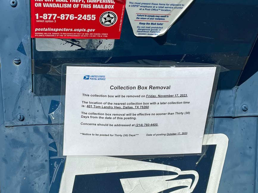 The U.S. Postal Service is removing blue collection boxes from post offices at 12,000 locations around the country — including three locations in Lake Highlands — and replacing them with high-security boxes. The action is intended to thwart a wave of robberies and mail thefts.