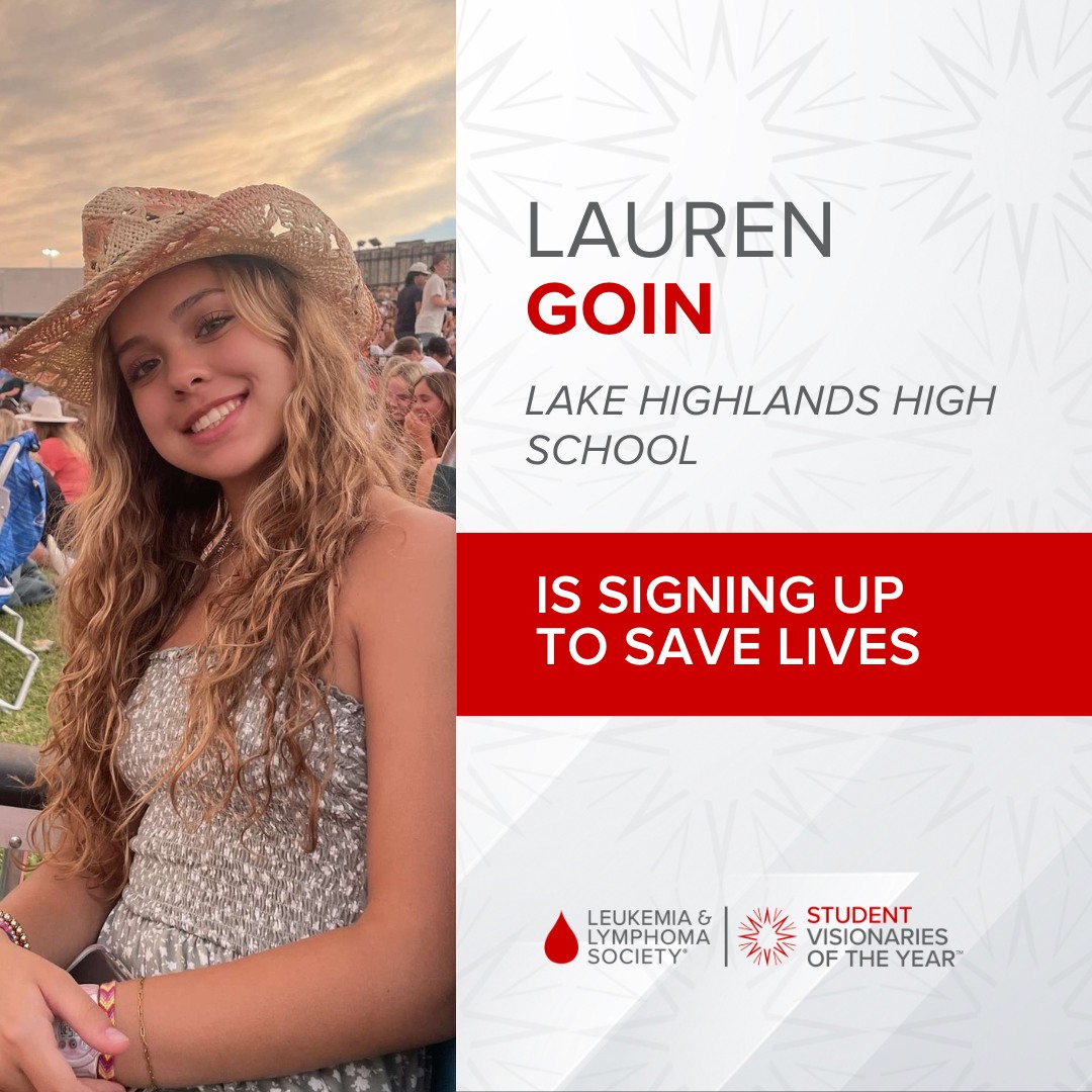 Lake Highlands High Senior Class President Lauren Goin proves that old rule that if you want things done, you should find a busy person to do them. Goin, who distributed handmade bracelets to young hospital patients in 2022 and was nominated last year for a national award through her National Charity League chapter, is one of 20 high school students in Dallas County serving as a team leader in the Leukemia & Lymphoma Society’s Student Visionaries of the Year campaign. She’s participating in their seven-week leadership development program to raise money and awareness to help blood cancer patients survive and thrive after treatment.