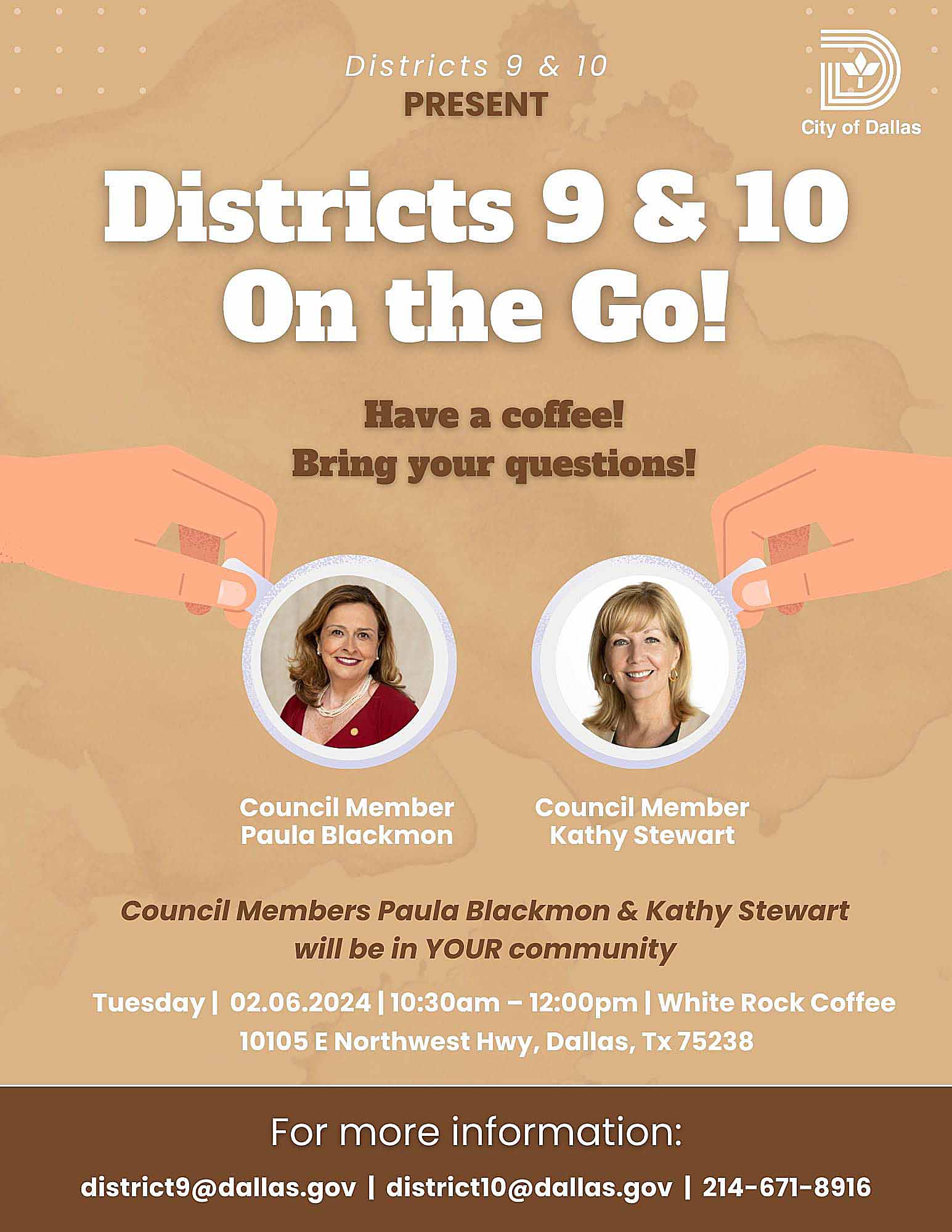 “District 9 and 10 On the Go” will be held Feb. 6 from 10:30 a.m. to noon, and attendance is free. White Rock Coffee is at 10105 E. Northwest Hwy., and no reservation is required.