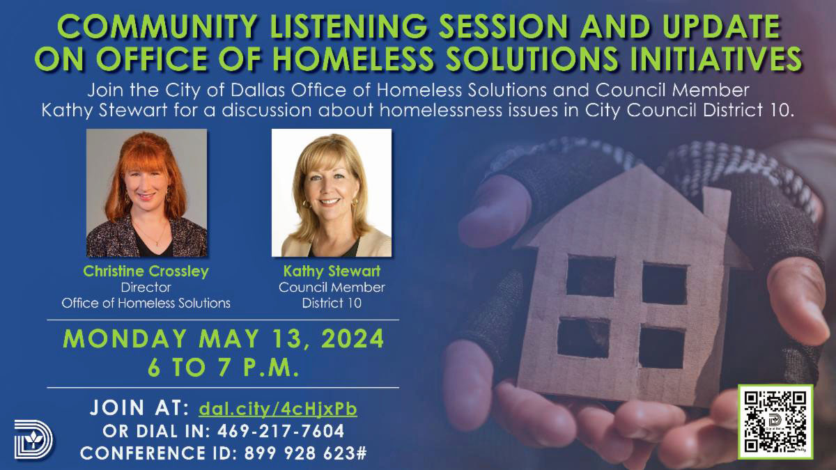 Council member Kathy Stewart says District 10 has faced numerous challenges, and one of the most pressing is homelessness. She’s hosting a listening session Monday, May 13 at 6 p.m. with Christine Crossley, Director of Dallas’ Office of Homeless Solutions.