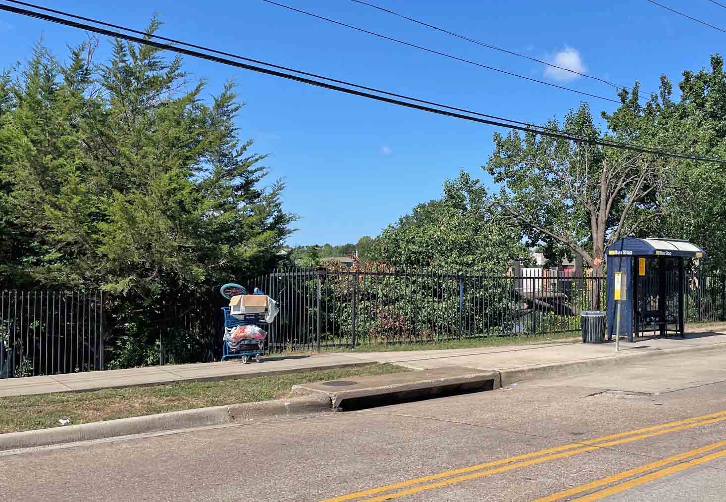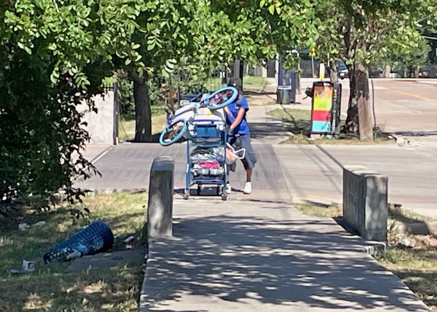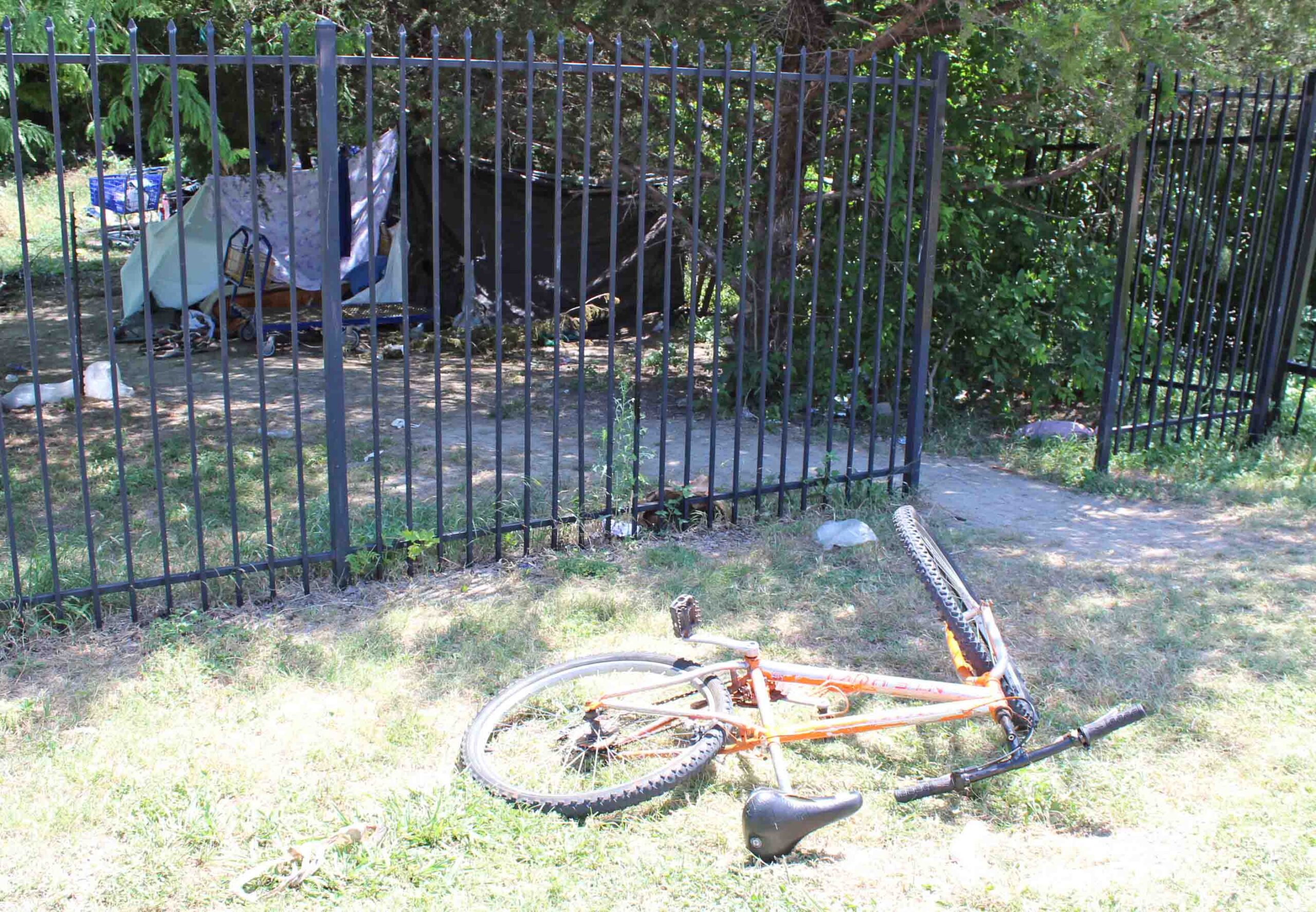 An opening has been cut in the metal fence behind Sam’s next to the DART bus stop on Melody Lane. While I watched Tuesday and Wednesday of this week, individuals arrived rolling shopping carts loaded with bicycles and other goods. Some items are stashed in an encampment under the trees behind the bus stop, but others are bunched on the rocks down near the creek bed under the bridge.