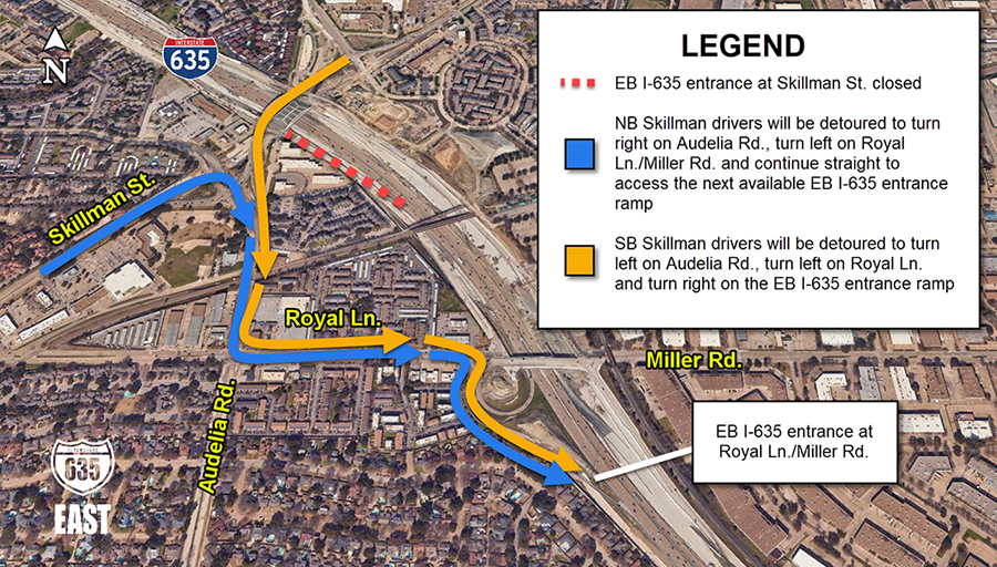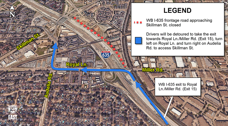 District 10 Council Member Kathy Stewart announced by newsletter that beginning last Friday, the westbound I-635 frontage road approaching Skillman St. from Miller Road and the eastbound entrance ramp at Skillman St. would be closed for long-term temporary closures. Both closures are expected to remain in effect through September, weather permitting, according to the Texas Department of Transportation. Traffic will be rerouted in the meantime.