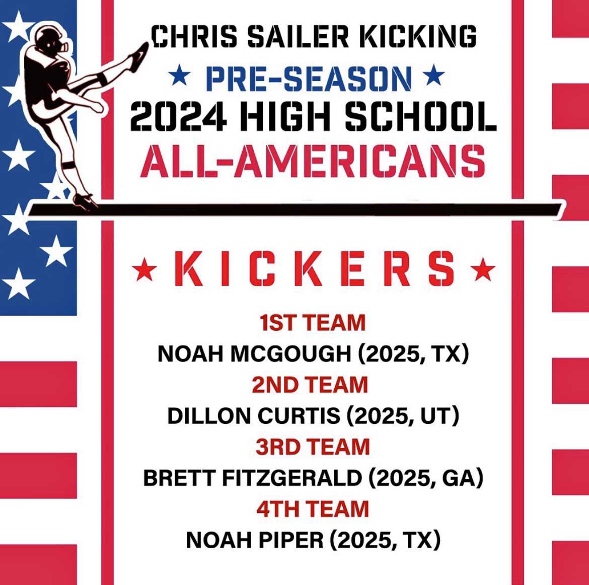 These days, Noah is senior kicker on the Jesuit Dallas football team. But he’s not just any kicker. Noah has been training with Chris Sailer, founder of the elite national Chris Sailer Kicking School. Last week, Sailer released the pre-season list of All-American High School Kickers for 2024. Noah is at the top of the list.