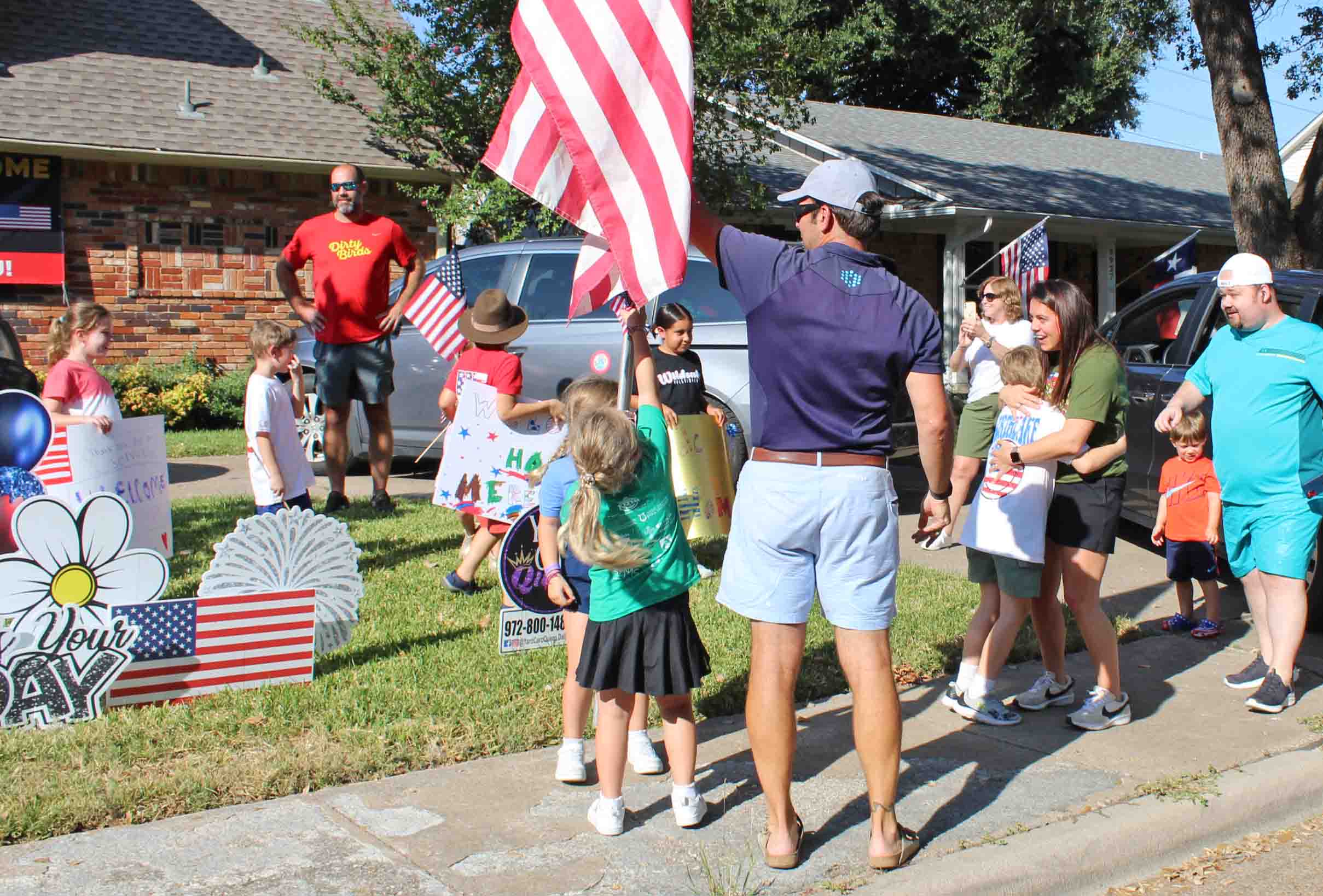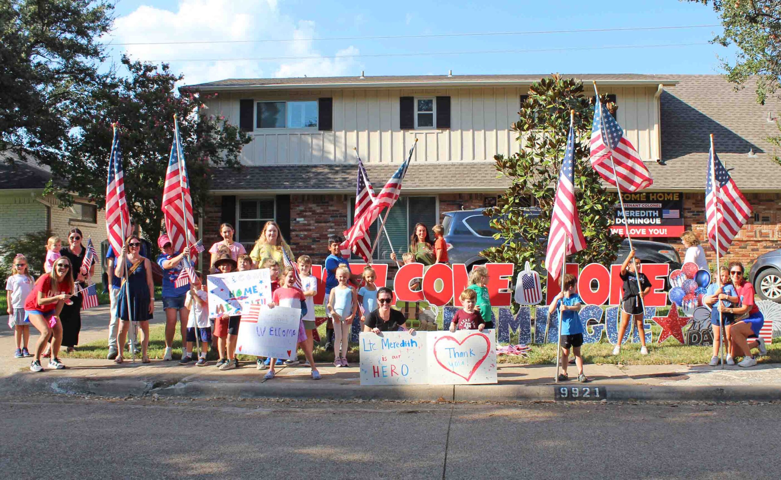 Lieutenant Colonel Meredith Domingue returned to Lake Highlands Wednesday after a nine-month deployment in Baghdad. Excited neighbors and friends lined her leafy lane wearing red, white and blue and waving American flags to demonstrate their appreciation. Children shook handmade posters to welcome “Miss Meredith” back home.