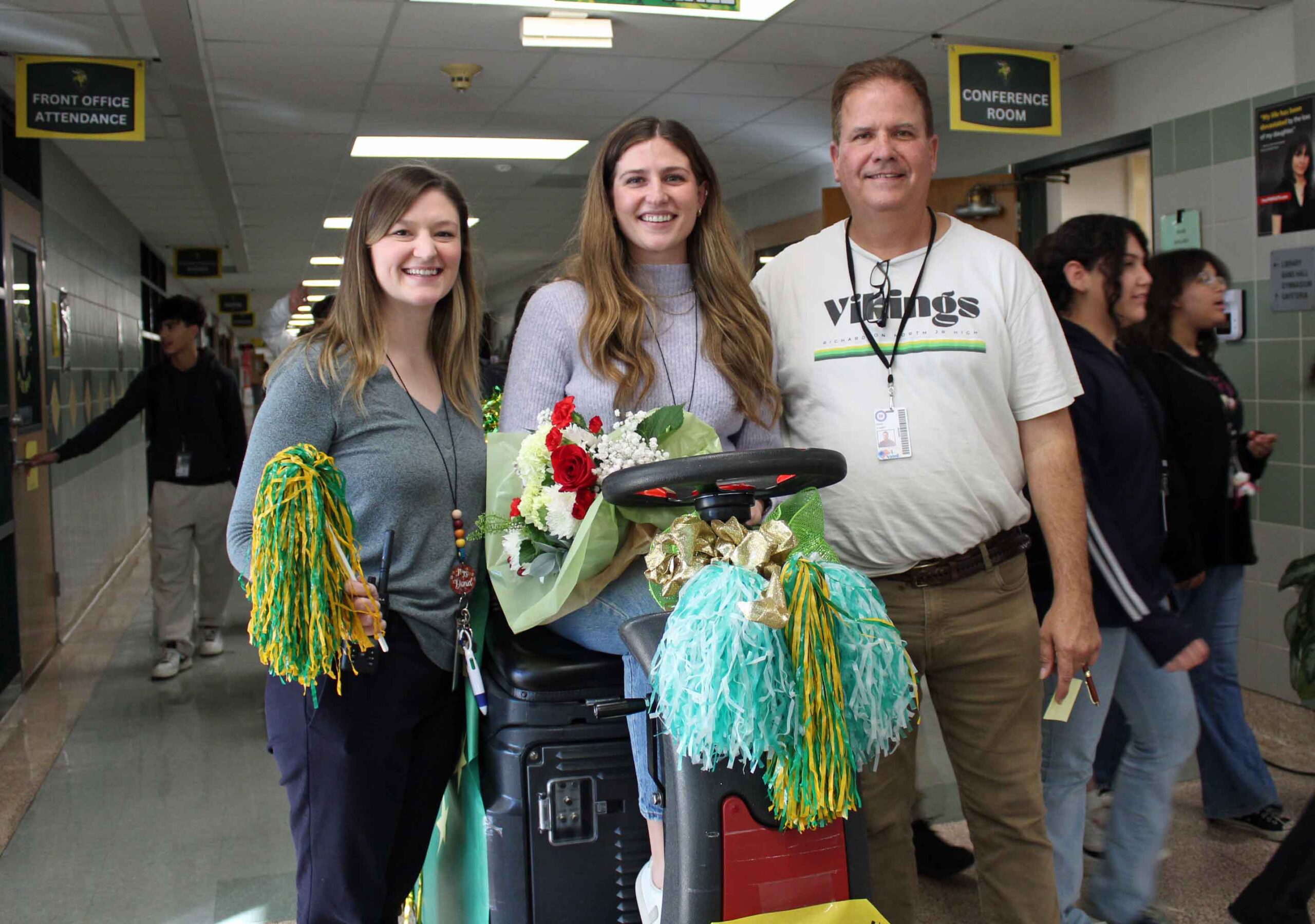 Lake Highlands High School graduate Katherine McCoy was surprised Wednesday when Richardson North Principal Doug Planey announced over the loudspeaker that she’d been voted the school’s Teacher of the Year. As students and fellow teachers spilled out of their classrooms to cheer her on, she was led on a mini-parade around campus by a Zamboni-esque floor sweeper decorated in green and yellow — the school’s colors.