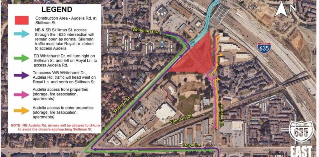 Skillman at I-635. Courtesy of Pegasus Link Constructors.According to an email from District 10 Council Member Kathy Stewart, traffic at the Skillman-Audelia intersection will reopen in all directions later this month, although no specific date has been specified. Portions of the intersection and Audelia Road have been closed since November, with traffic affected on both sides of I-635.