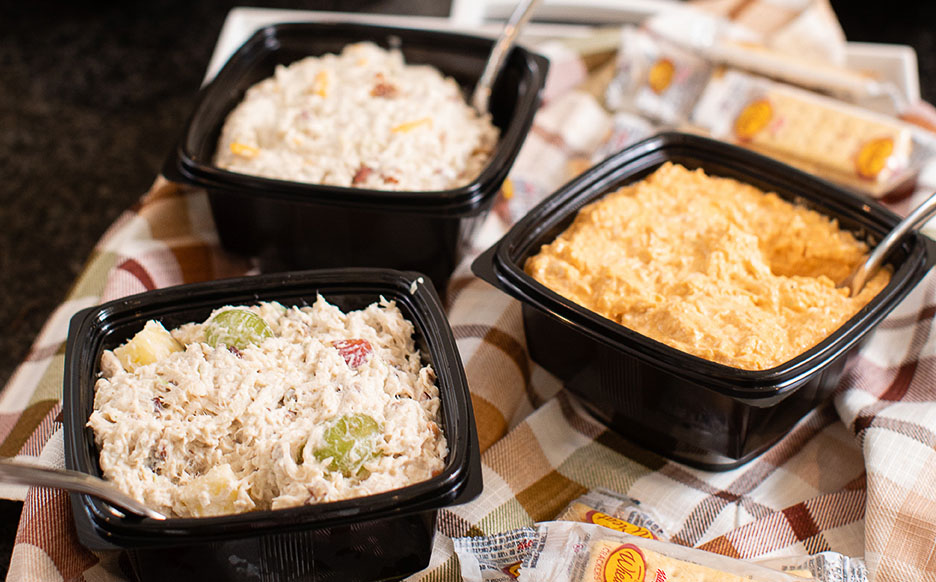 My favorite flavors? The Classic Carol is safe, with finely minced celery and mayo, but I always grab a tub of Olivia’s Old South, with sweet pickles and egg. Fancy Nancy is the fruity choice, with apples, grapes and pecans, and if the menfolk are joining, I get the hickory smoked Barbie-Q and spicy pimento cheese.