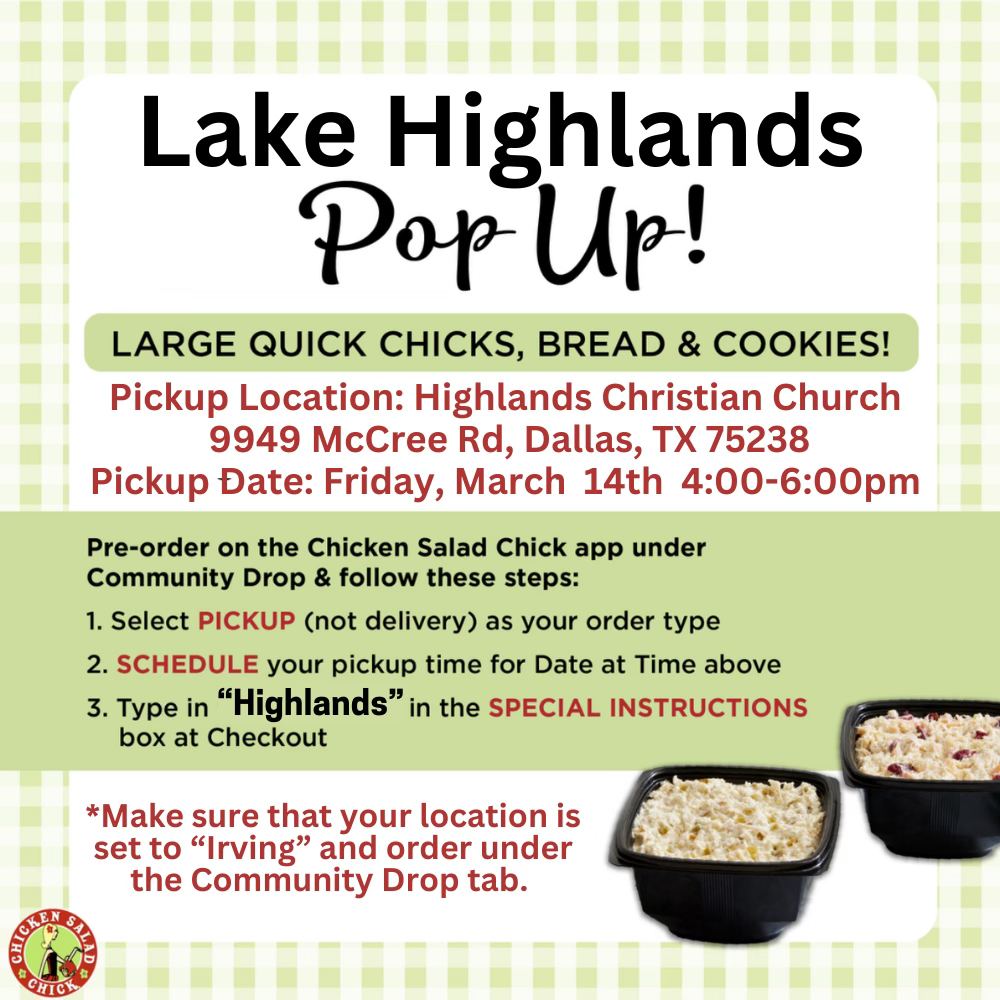 This Friday, Chicken Salad Chick will host a Lake Highlands pop up shop from 4-6 p.m. at Highlands Christian Church, 9949 McCree. You’ll need to preorder on their app under “community drop” and set the location to “Irving.” Select “pickup” with your time, and enter “Highlands” in the special instructions box under each selection.