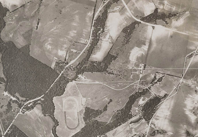 Taken by Lloyd M. Long between 1930-40, shows the outline of the doomed Hilltop Stables racetrack. Photo courtesy of Edwin J. Foscue Map Library, Southern Methodist University.